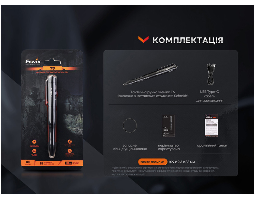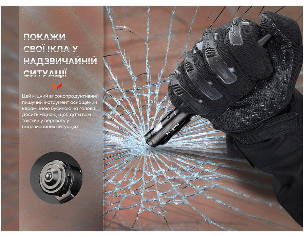 Тактична ручка Fenix T6 є автоматичною моделлю для самооборони, здатна підсвічувати, розбивати вікна і писати. Максимальна яскравість освітлення становить 80 люменів, а далекобійність променя – 18 метрів. Ручка підтримує заряджання Type-C. Для свічення в ручці використовується якісний світлодіод з терміном служби 50 тисяч годин. Живлення походить від внутрішнього літій-полімерного акумулятора ємністю 100 мАг. Заряджання здійснюється за допомогою порту USB Type-C. Ця міцна модель забезпечена керамічною кулькою, яка допомагає розбити скло та врятуватися у надзвичайних випадках. Усередині є імпортний картридж Schmidt для плавного та легкого листа. Як і очікувалося, цей міцний та високопродуктивний інструмент для письма досить міцний, щоб надати вам перевагу в тактичних операціях.