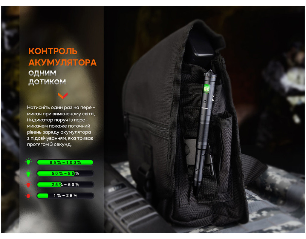 Індикація рівня заряду: щоразу, коли ліхтар у тактичній ручці вмикається, індикатор демонструє ступінь зарядженості батареї та горить протягом трьох секунд. Зелене світло: 100% -85%; миготливе зелене світло: 85%-50%; червоне світло: 50% -25%; миготливе червоне освітлення – 25%-1%.