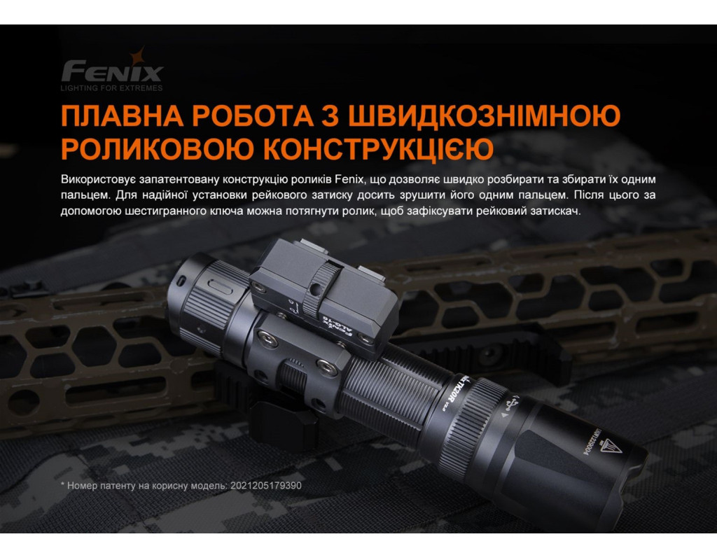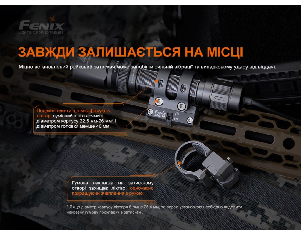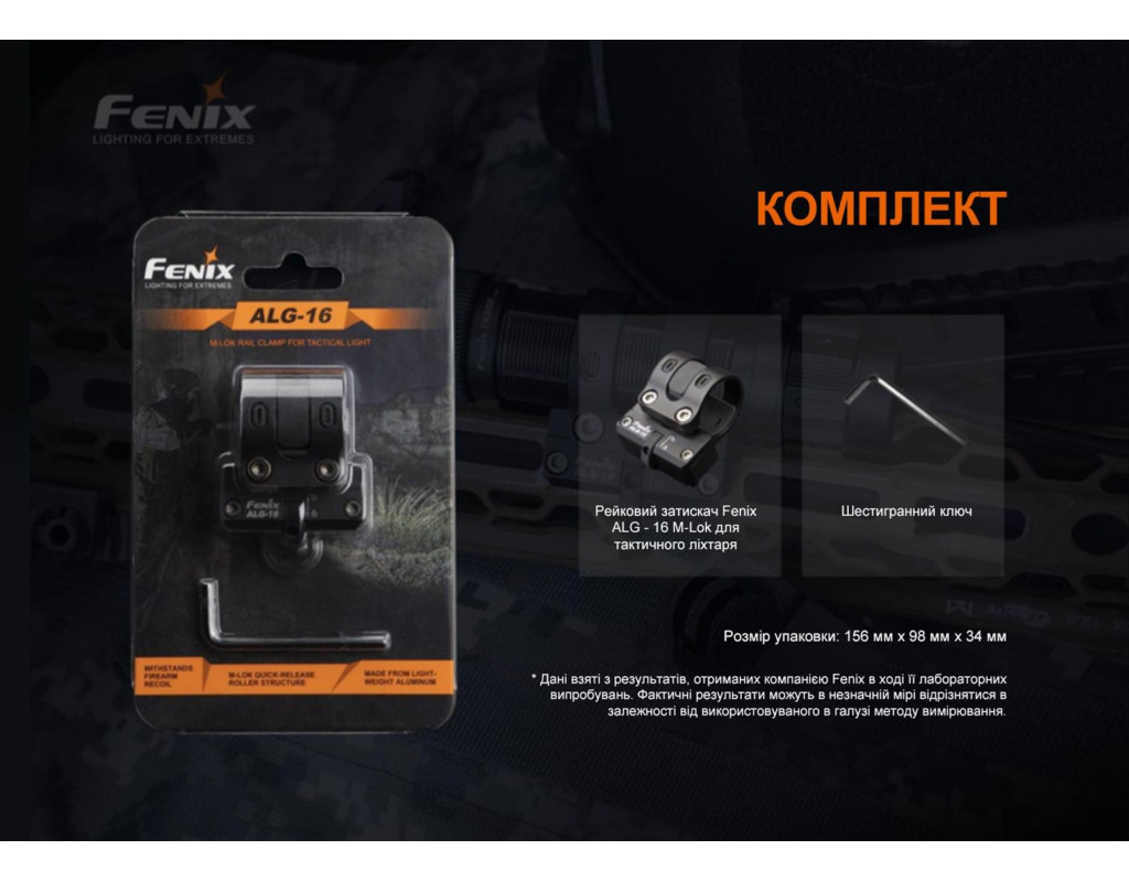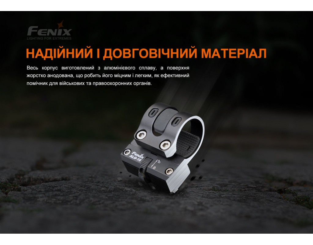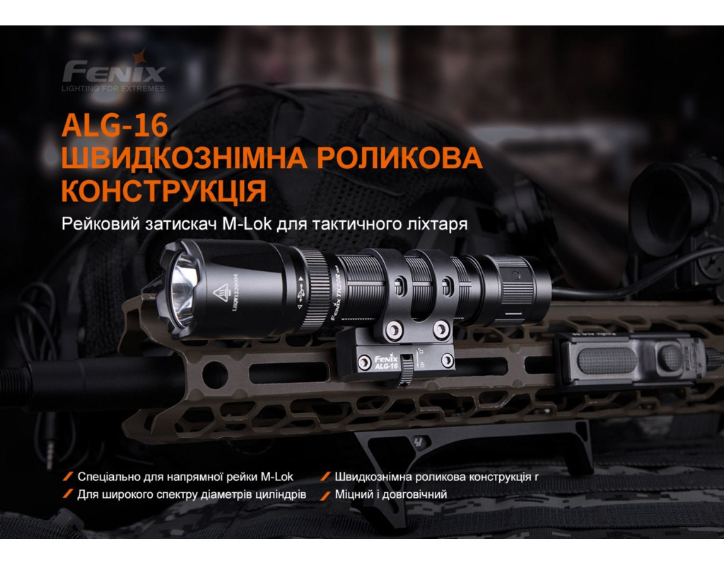 Металеве кріплення ALG-16 сумісне з тактичними ліхтарями Fenix, діаметр хвоста яких знаходиться в межах від 22.5 до 26 міліметрів, а діаметр головної частини не перевищує значення 40 міліметрів. Аксесуар призначений для фіксації освітлювального пристрою на зброї із модульною системою кріплення M-Lok. У кріпленні використано запатентований роликовий механізм для швидкого встановлення та зняття аксесуара. Це можна зробити однією рукою шляхом прокручування ребристого коліщатка у необхідному напрямку. Для більш надійної фіксації кріплення коліщатко потрібно додатково затягнути за допомогою шестигранного ключа з комплекту. З внутрішньої сторони посадкового кільця є пара прогумованих вставок для щільного утримання ліхтаря всередині, що особливо важливо у разі віддачі під час стрілянини. Вставки також запобігають появі подряпин на гладкій поверхні корпусу ліхтаря. Якщо діаметр хвоста освітлювального пристрою складає більше 25.4 міліметрів, то вставки необхідно зняти для коректної установки моделі посадкове кільце. Кріплення ALG-16 виготовлене з алюмінієвого сплаву. Це нержавіючий, ударостійкий метал, який має дані властивості, в тому числі завдяки анодованій обробці. Розмір моделі: 51.7 x 42.1 x 30.1 міліметр. Аксесуар важить всього 53.3 грами, тому не надає негативного впливу на вагу зброї. Комплектація В упаковці габаритами 156 х 98 х 34 мм знаходиться кріплення Fenix ALG-16 та шестигранний ключ. Характеристики: