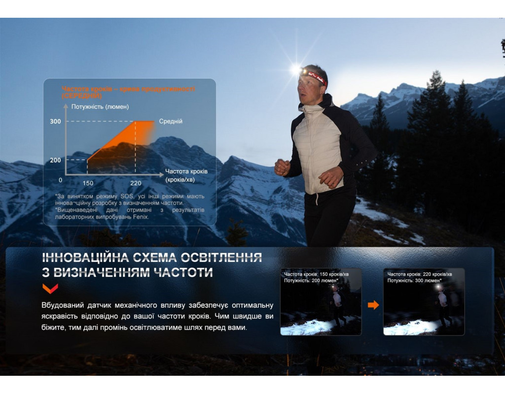 | Ліхтар Fenix HL32R-T Black (HL32R-TBK) — це ідеальний супутник для трейлранінгу та активного відпочинку, що поєднує легкість, яскравість і численні функціональні можливості. Виготовлений з магнієвого сплаву, корпус забезпечує мінімальну вагу та максимальну міцність. Завдяки цьому, загальна маса ліхтаря складає всього 107 грамів, що дозволяє зменшити навантаження під час тривалих тренувань на 30% у порівнянні зі схожими моделями з алюмінієвим корпусом. Оснащений світлодіодом Luminus SST20, ліхтар забезпечує холодне біле світло з колірною температурою 6500К та максимальну яскравість до 800 люменів, здатну досягати дальності світлового потоку до 132 метрів. Інноваційний датчик частоти кроку автоматично керує інтенсивністю світла, адаптуючи його до швидкості вашого руху — від 200 до 300 люменів у діапазоні від 150 до 220 кроків за хвилину. Fenix HL32R-T пропонує 7 режимів роботи, включаючи максимальний, середній, мінімальний, ближнє та дальнє світло, а також SOS. Вони діляться на дві групи: для дальнього освітлення та для ближнього, що включає миготливий сигнал. Завдяки цифровому регулюванню струму, ви отримуєте стабільне та надійне освітлення у будь-якому режимі. Заживлення відбувається через акумуляторний Li-ion блок ARB-LP1900 або три батарейки формату AAA, що дає можливість вибирати найбільш підходящий спосіб для вашого стилю життя. Літієвий блок заряджається через порт USB Type-C, забезпечуючи автономність до 12.5 днів разового використання. На передній частині корпусу розташовані індикатори заряду, які дозволяють легко оцінити рівень енергії для своєчасної підзарядки. Дизайн вирізняється комплексом ергономічних рішень, що роблять його неймовірно зручним у використанні. Широка еластична стрічка з запатентованим механізмом регулювання дозволяє комфортно закріпити ліхтар на голові, а механізм блокування гарантує надійність і запобігає випадковому ввімкненню. Корпус витримує падіння з висоти до 2 метрів та відповідає стандарту IP66, забезпечуючи захист від вологи та пилу в умовах негоди або екстремальних температур від -35°C до 45°C. З Fenix HL32R-T, потужним і надійним ліхтарем, ви завжди будете готові до нових викликів і нічних пригод, незалежно від умов або місцезнаходження. Комплектація включає акумуляторний блок живлення, кабель USB Type-C, а також гарантію та інструкцію, щоб ви могли швидко почати насолоджуватися всіма можливостями цього універсального ліхтаря. |