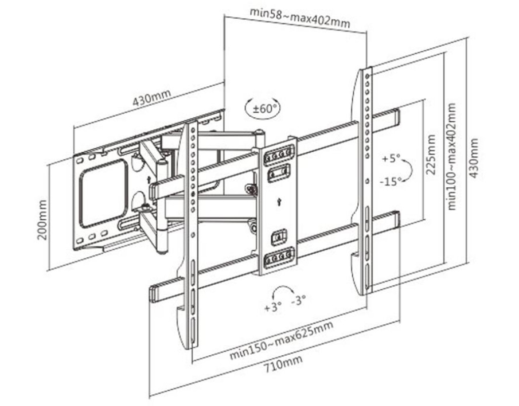 Надійний сталевий настінний кронштейн Підходить для більшості телевізорів або моніторів з розміром екрану 37 - 80 дюймів Сумісний зі стандартами VESA 600 x 400 мм Дозволяє повертати монітор на 120 градусів і нахиляти на 20 градусів Відстань від стіни: 58 - 402 мм У комплект включена вся необхідна для установки фурнітура |