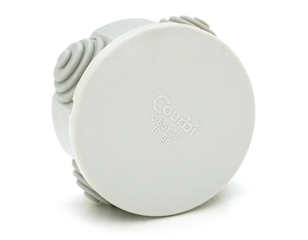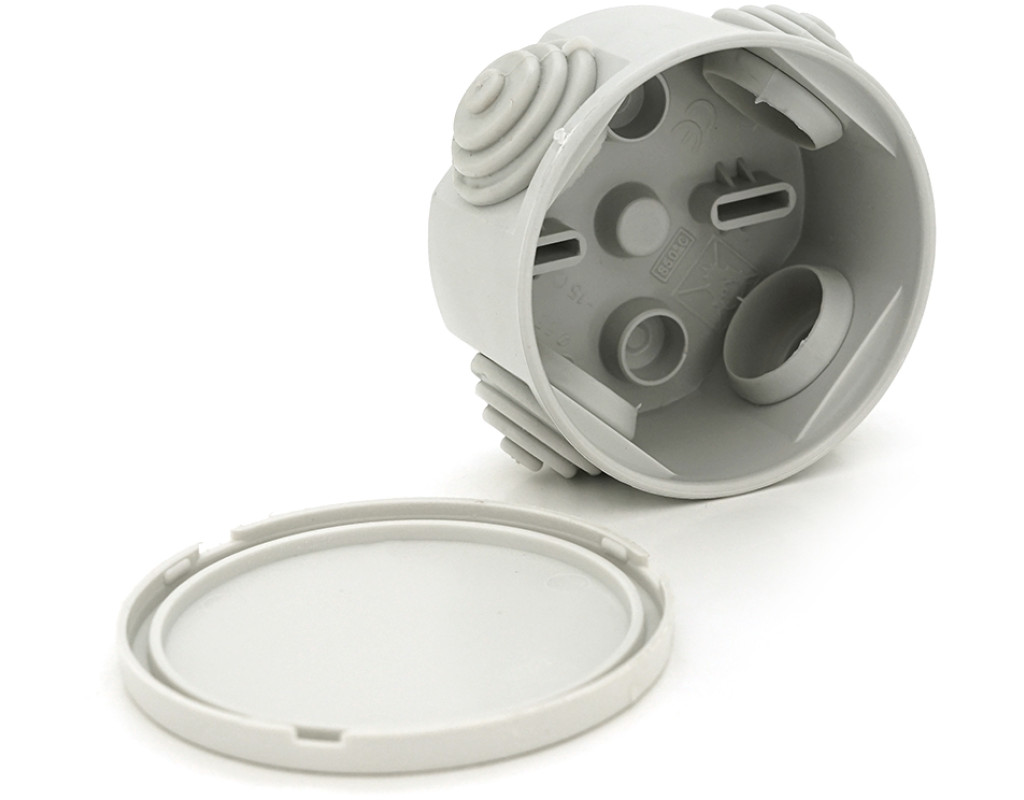 | Коробка розподільна Ø65х35 сіра не корродує, Ударостійка та стійка до тиску. Виготовлений із стійкого полімерного матеріалу. Властивості самозагасання, що не розповсюджують горіння. З кришкою, що замикається Коробки розподільні для зовнішнього монтажу |