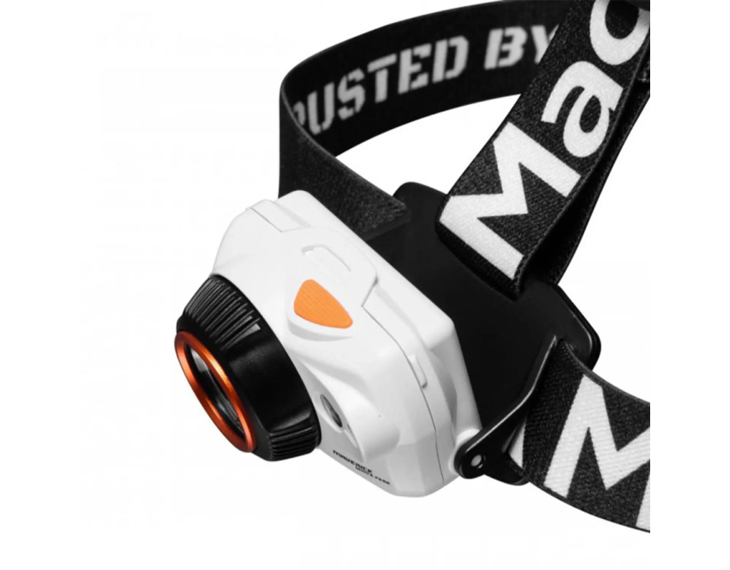 Налобний ліхтар Mactronic Maverick White Peak (320 Lm) Focus - це легкий, компактний і надійний ліхтар з висувною лінзою (системою фокусування променя) і сенсором руху для безконтактного ввімкнення/вимкнення ліхтаря. Модель живиться від трьох батарей ААА і може працювати до 60 годин в економ режимі. Опціонально ліхтар може живитись від змінного акумулятора RB0128 (Li-Pol 3.7V). Висувна лінза плавно регулює ширину променя. Завдяки цьому Mactronic Maverick здатний ефективно освітлювати як місцевість на відстані до 150 метрів, так і освітити кемпінговий табір або інше місце дислокації. Ремінець із внутрішньої сторони покритий силіконом, завдяки якому він добре тримається на голові або головному уборі, та має додатково маківковий пасок кращого балансування. Сенсор руху реагує на помах рукою біля ліхтаря, що значно спрощує роботу для користувачів у рукавичках або з брудними руками. Крім того, система альтернативного живлення DSS™ дозволяє опціонально використовувати акумулятор RB0128 (Li-Pol 3.7V). Кут нахилу ліхтаря регулюється у п'яти положеннях. Все це робить Macronic Maverick White Peak відмінним вибором як для туристів і кемперів, так і для спортсменів лижників і велосипедистів, та й просто для повсякденного використання. Ліхтар має 5 режимів роботи, серед яких: сенсорний режим з плавним регулюванням яскравості (ADS Tech), три режими з попередньо встановленою яскравістю та режим миготіння. Кнопка ввімкнення знаходиться у верхній частині корпусу. Перемикання режимів відбувається повторним натисканням цієї кнопки. Модель Mactronic Maverick має всі сучасні захисні системи, які дозволяють уберегти ліхтар від короткого замикання, перегріву, механічних пошкоджень або попадання вологи всередину. Корпус цієї моделі забезпечує захист за стандартом IP64 (повний захист від пилу і водяних бризок з будь-якого напрямку) і ударостійкість при падінні з висоти до 2 м на бетон. Тобто ліхтареві не страшний проливний дощ чи випадкове падіння. Ліхтар укомплектований еластичним регульованим ременем з силіконовим покриттям з внутрішньої сторони і трьома батарейками ААА Duracell. Додатково можна придбати акумулятор. Технічні характеристики: