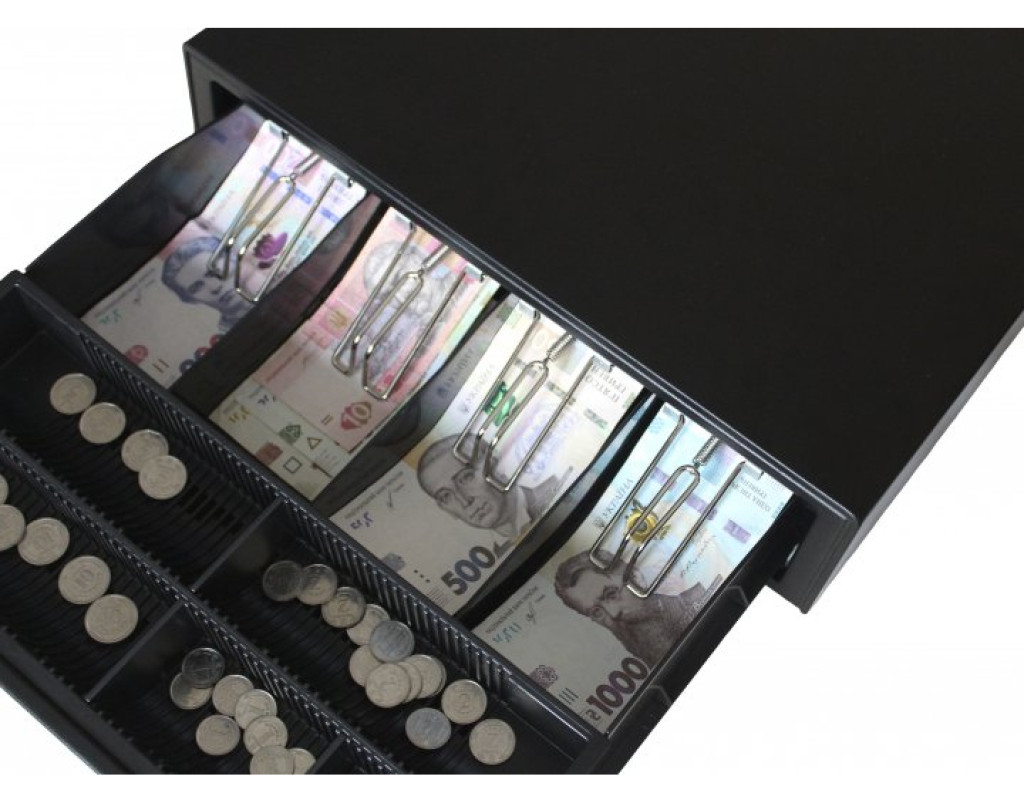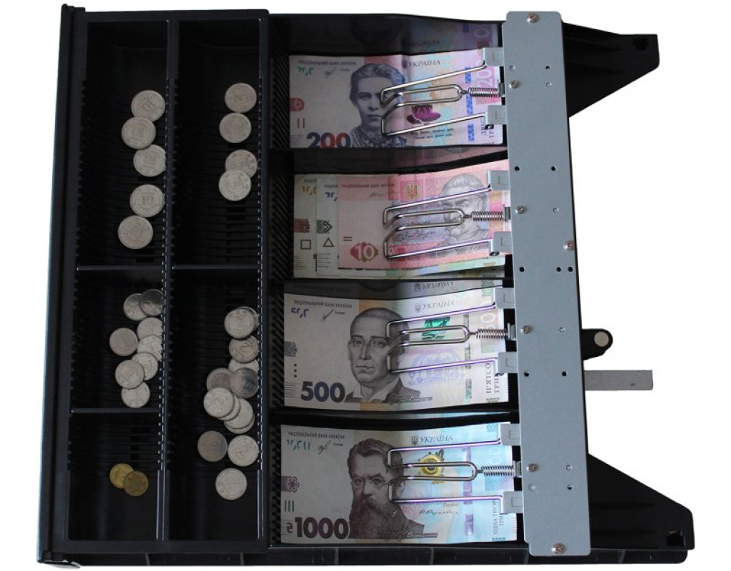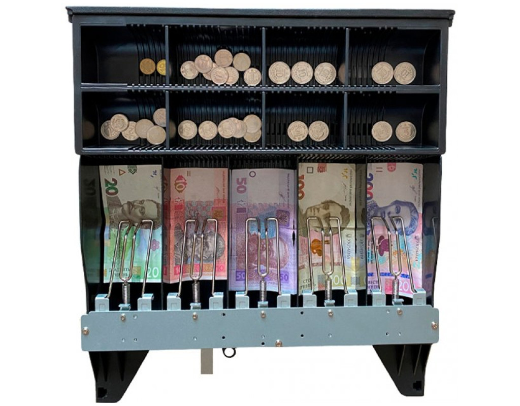 Конструкція відділень для монет і купюр дає змогу змінювати їхню ширину, завдяки чому можна легко розміщувати купюри та монети будь-якого номіналу. На передній панелі висувної частини розташовується проріз для вкидання купюр і документів. Банкноти надійно притискаються пружними металевими механізмами. Ящик має замок на три положення ключа — закрито, відкриття за командою від інтерфейсу RJ12 (фіскальний реєстратор, принтер, каса), відкриття вручну.