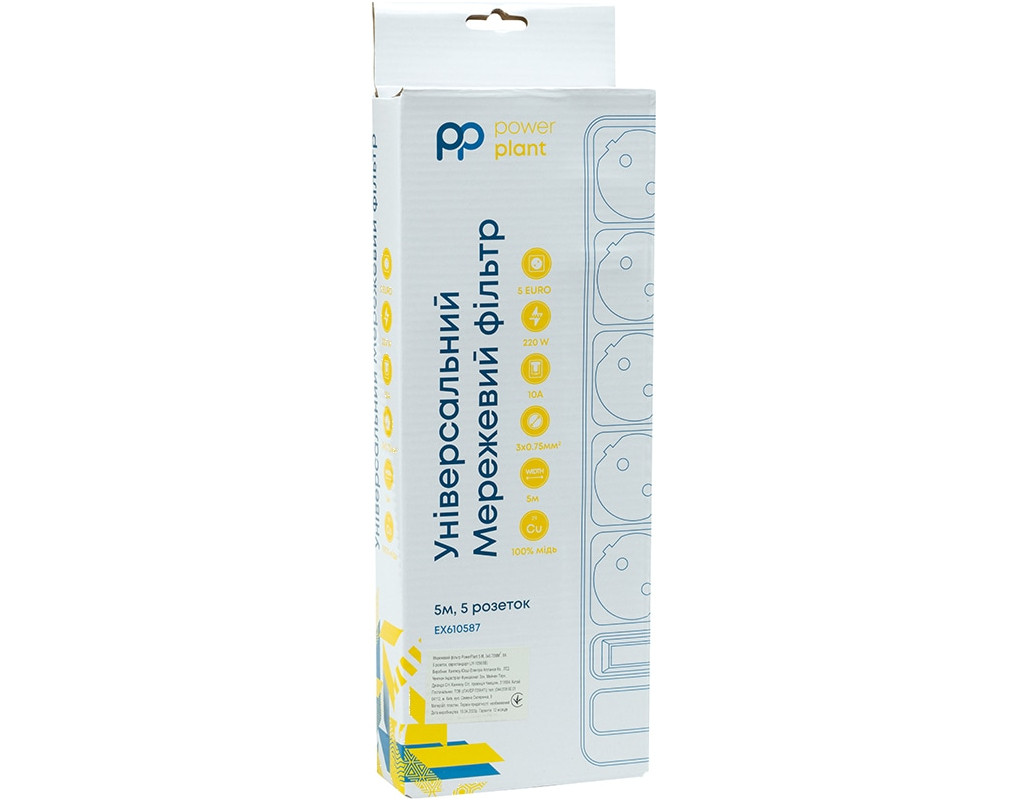 Мережевий фільтр PowerPlant (JY-1056/5B) на 5 розеток призначений для підключення широкого спектру комп'ютерної, побутової та електронної техніки до електричної мережі змінного струму з номінальною напругою не більше 250В та номінальним струмом не більше 10А. Кабель довжиною 5 м дозволить підключити техніку в місцях віддалених від стаціонарних розеток. Ізоляційний матеріал H05VV-F та провідники зі 100% міді гарантують високу стійкість до температур та механічних пошкоджень, а також максимальну електропровідність та стійкість до навантажень. Корпус мережевого фільтра виготовлений із вогнестійкого пластику. Фільтр оснащений універсальними розетками євростандарту із заземленням. Надійний та зручний подовжувач захистить електронну техніку від короткого замикання та перепадів напруги. Фільтр PowerPlant стане відмінним помічником у будинку, офісі або на дачі. |