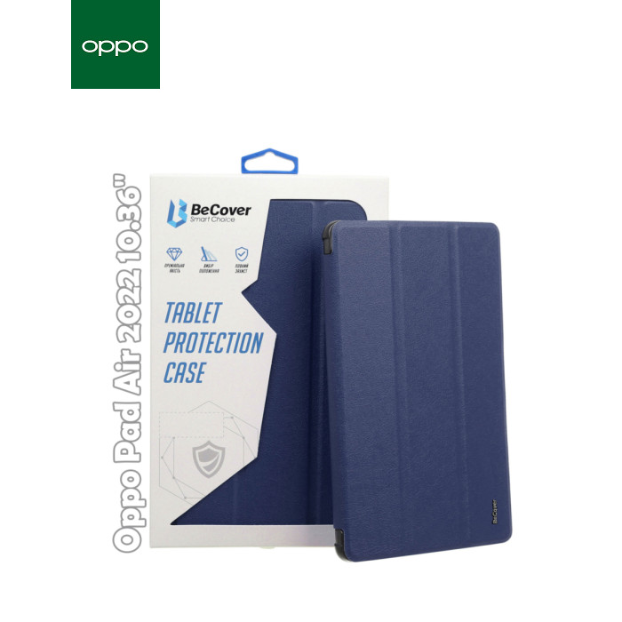 Тип - обкладинка, Сумісність з моделями - Oppo Pad Air 2022, діагональ - 10.36, Спосіб кріплення - обкладинка, спосіб закриття - магніт, Матеріал - поліуретан, штучна шкіра, темно-синій