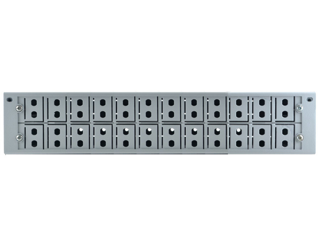 Оптична розподільча 2 -х юнітова панель Crosver FOB 19/2-400A/24-2-48-FC призначена для розміщення зростків оптичного волокна, роз’ємного підключення та комутації оптичних патчкордів. Панель встановлюється в 19-дюймову стійку (або шафа) та є універсальним для реалізації вводно-розподільчих пристроїв, телекомунікаційних кросів, серверних кімнат та інших комунікаційних центрів. Панель складається з сталевого корпусу зі знімною кришкою та висувної передньої панелі. Висувна панель забезпечує доступ до сплайс-касети без демонтажу зі стійки. На передній панелі є 48 посадочних місць для установки адаптерів типів FC. Також для полегшення доступу до внутрішньої частини панелі вона має знімну верхню кришку, що закріплюється на гвинтах. Лінійний кабель може заводитися через задню стінку панелі і кріпитися до стінки нейлоновими стяжками з комплекту. Передбачена можливість кріплення силового елементу в гвинтовій стійці, на задній стінці панелі. На висувній панелі встановлений кронштейн для кріплення сплайс-касет типу S400-A, які добре зарекомендували себе в складі популярних кабельних муфт Crosver FOSC-TA400. Всього можуть встановлюватися в стек до 5 таких касет, сумарною ємністю до 60 або 120 (в два ряди) зварних з'єднань. Запас волокон кабелю і підварених до них пігтейлів укладається в організаторах касет. На передній панелі розташовані планки для встановлення 48 адаптерів типів FC. При необхідності планки можуть відгинатися всередину для установки адаптерів під кутом 45° по відношенню до лицьової частини. Це спрощує організацію кабелів, дозволяє уникнути різких перегинів патчкордів, виведених з передньої частини панелі та укладених в організатор. У комплект панелі входять монтажні кронштейни, призначені для кріплення в стійку 19" (вуха), а також організатор патчкордів - металева полиця, яка кріпиться до лицьової частини панелі. |