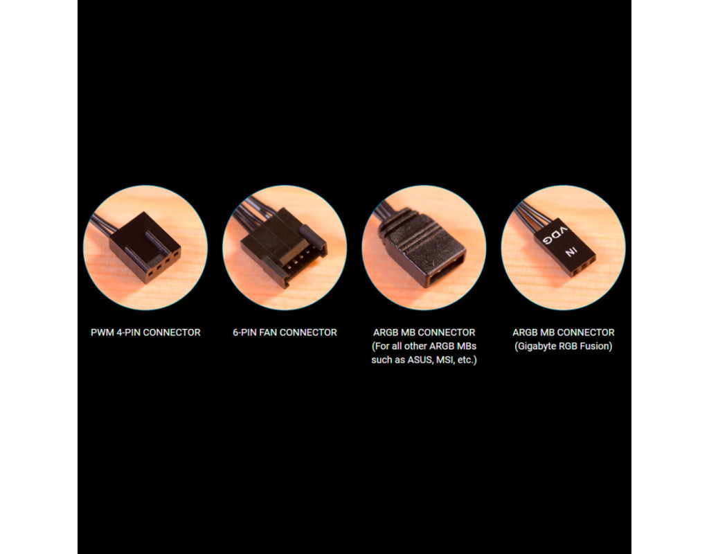 120-міліметровий вентилятор із 6-контактним роз'ємом оснащений стильним подвійним тонким світлодіодним круговим підсвічуванням RGB. Доступ до 16,8 млн кольорів здійснюється із сумісних системних плат з адресованим RGB-підсвічуванням, включно з ASUS Aura Sync, MSI Mystic Light Sync і Gigabyte RGB Fusion. Він оснащений 6-контактним перехідним кабелем для під'єднання вентилятора до сумісних системних плат із адресованим RGB-підсвічуванням.