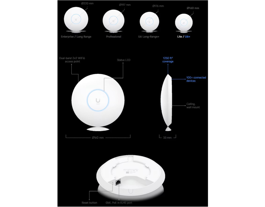UniFi 6+ - це потужна дводіапазонна точка доступу Wi-Fi з підтримкою частотних діапазонів 2,4 і 5 ГГц і швидкістю передавання даних до 2,4 Гбіт/с для 5 ГГц і 573,5 Мбіт/с для 2,4 ГГц. UniFi 6+ вдосконалене за дизайном рішення для хот-спотів усередині приміщень, що використовує стандарт 802.11a/b/g/n/ac/ax і оснащене антенною системою 2х2 MIMO. Має більш високий коефіцієнт посилення антени - 3 дБі (2,4 ГГц) і 5,4 дБі (5 ГГц). Точка доступу підтримує активне PoE. Призначений для горизонтального встановлення на стелі або вертикального монтажу на стіні. UniFi 6+ може покривати клієнтське середовище з високою щільністю розміщення. Особливості: