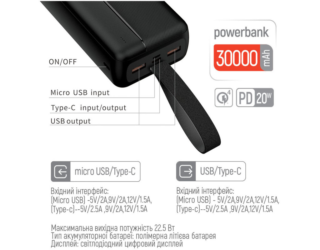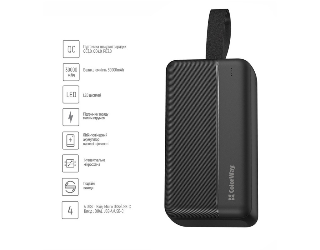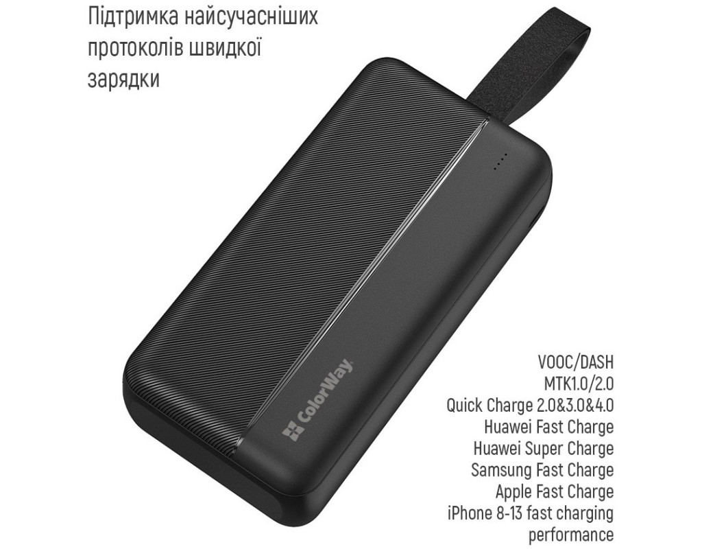 | Високоємний та функціональний УМБ ColorWay оснащений високоякісним літій-полімерним акумулятором 30000mAh, який має кілька рівнів захисту від короткого замикання та перепадів напруги, що гарантує безпеку та унеможливлює пошкодження мобільного пристрою. Підтримує практично всі сучасні протоколи швидкої зарядки такі як: (Power Delivery 3.0, Quick Charge 2.0&3.0&4.0, Huawei Fast Charge, Huawei Super Charge, Samsung Fast Charge, Apple Fast Charge, VOOC/DASH/WARP, MTK-PE+ 2.0), що дозволить із максимальною швидкістю заряджати Ваші пристрої. Можливість швидкої зарядки не тільки смартфона, а й самого Powerbank по Type-C - достатньо мати лише один кабель! Оснащений LED-індикатором, завдяки якому Ви зможете контролювати рівень заряду, а ємності в 30000 мА*год цілком вистачить для задоволення потреб у зарядці ваших гаджетів. |