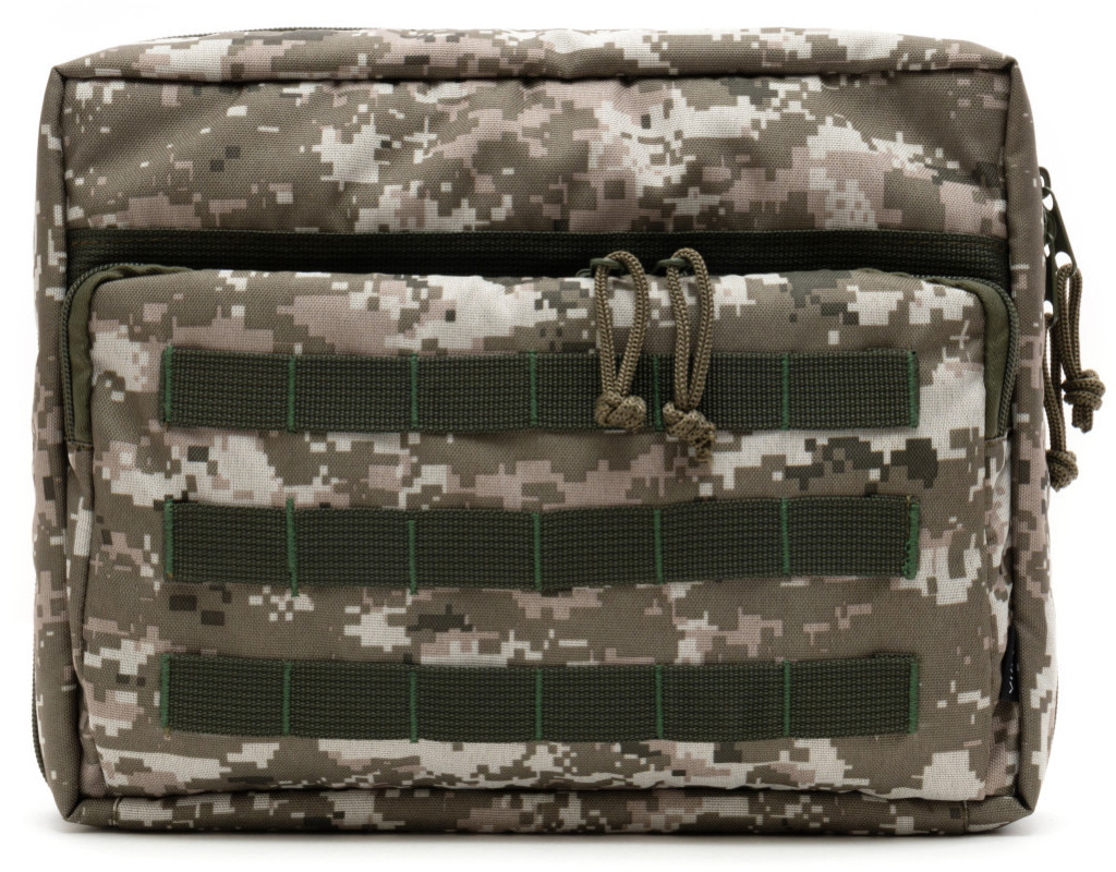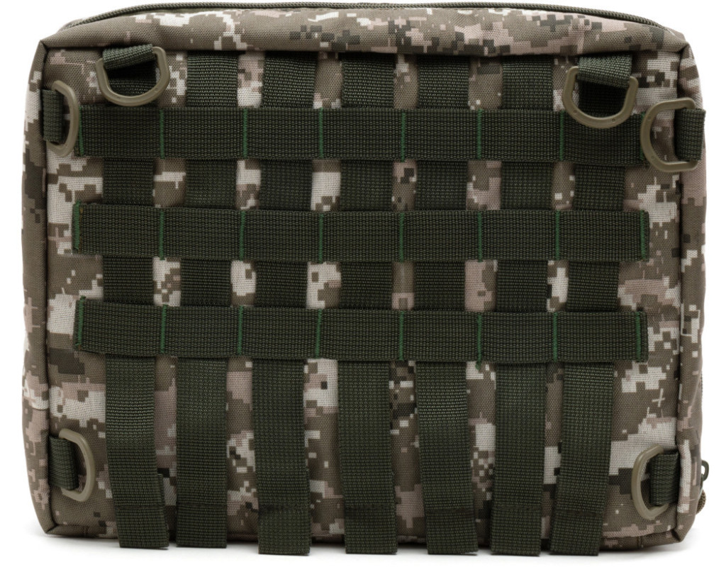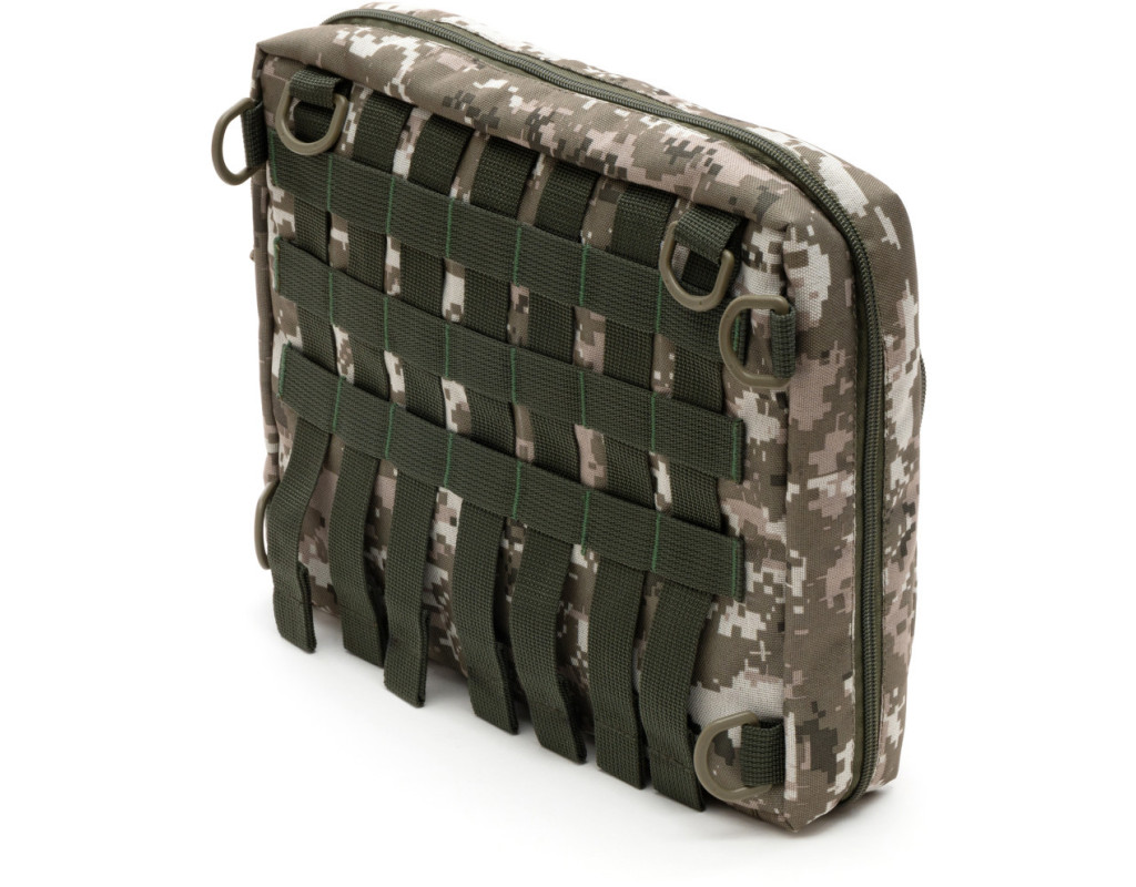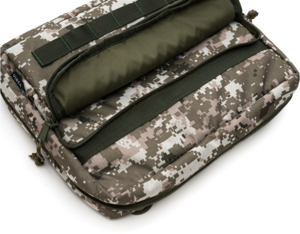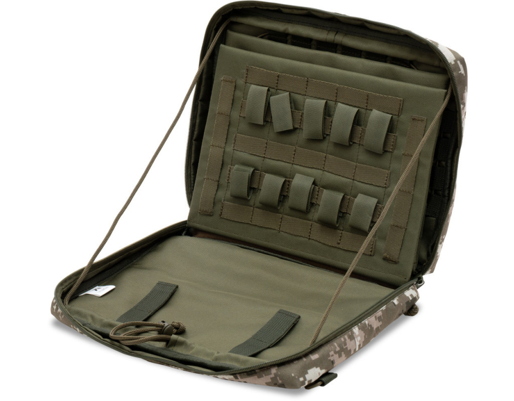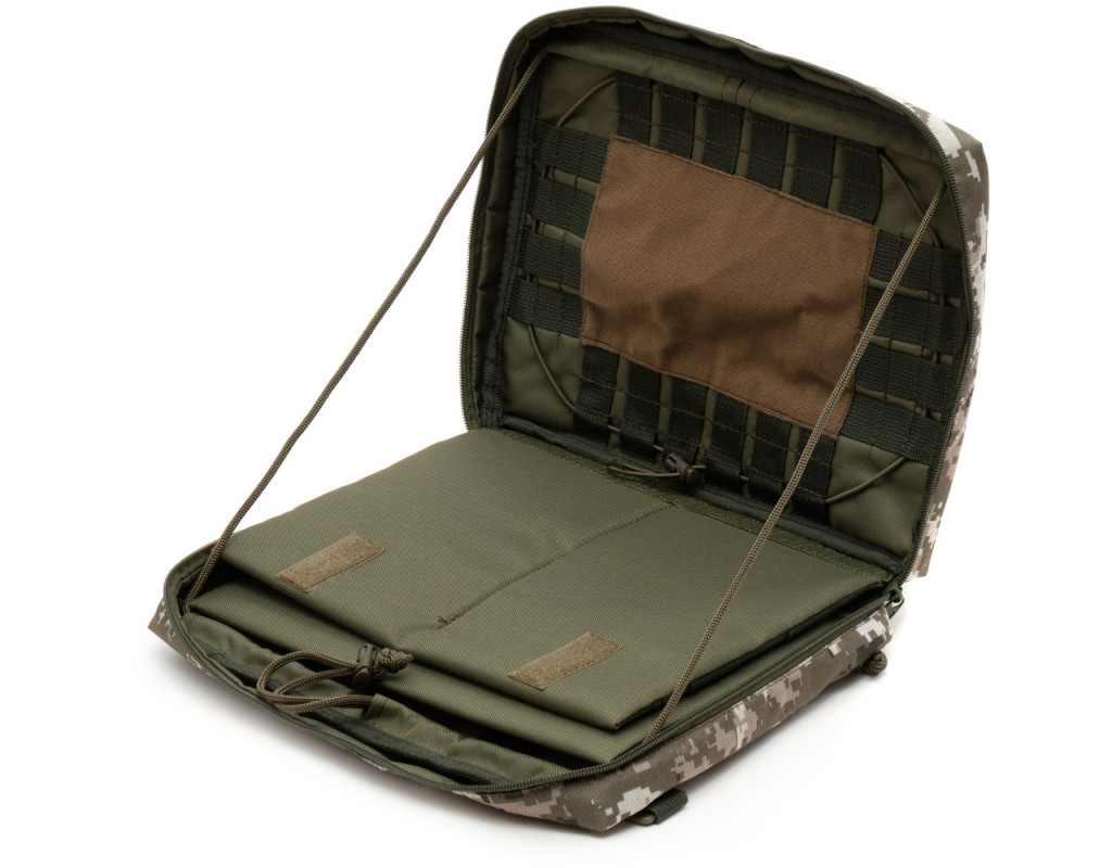 Зовні - водовідштовхувальна тканина Oxford 600D.Внутрішня частина з тканини Velcro, до якої кріпляться липучками знімні панелі-органайзери з отворами для кріплення тримачів для ручок, документів, кабелів, флешок та ін. Регулювання та фіксація кута відкриття до 360 градусів.