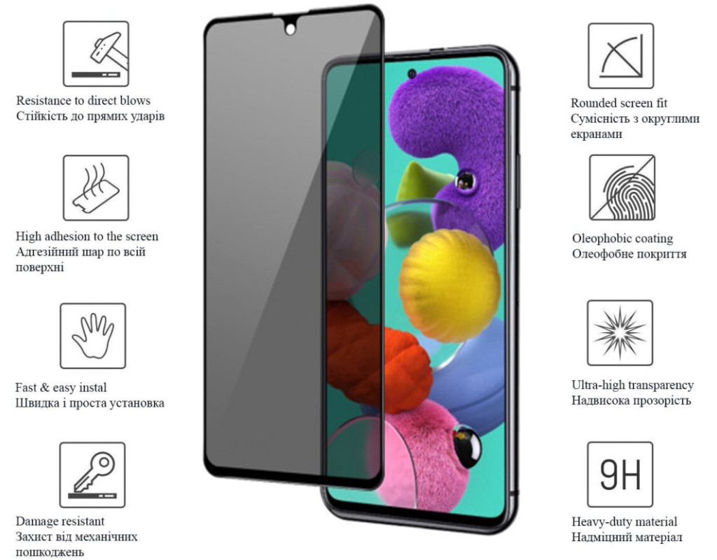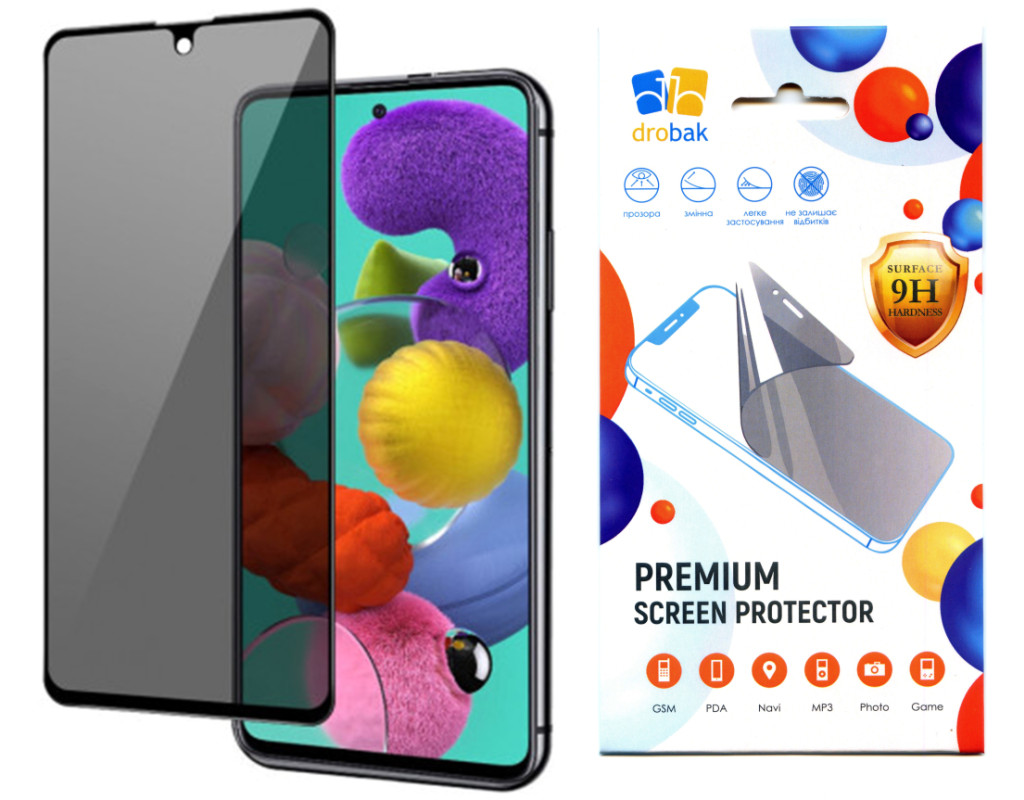 | Захисне скло Drobak Anti Spy для екрана набагато ефективніше від звичайних захисних плівок, позаяк воно виготовлене зі спеціально обробленого загартованого скла. Скло захищає екран від подряпин, навіть під час контакту з гострими металевими предметами. Крім того, скло так само захищає екран від ударів, оскільки встановлюючи його на телефон, ви отримуєте подвійний запас міцності екрана. Форма скла повністю відповідає цій моделі смартфона, а завдяки своїй жорсткості легко встановлюється на екран. Для цього досить очистити екран від бруду, зняти зі скла плівку, що закриває клейкий шар, і рівно прикласти скло на екран телефона. Знімається скло так само легко, оскільки клейкий шар виготовлений на основі силіконового покриття й після зняття не залишає слідів. Це захисне скло має унікальне покриття, з фільтром конфіденційності, що дає змогу приховати інформацію на екрані вашого пристрою від сторонніх. Завдяки цьому покриттю, екран смартфона буде видно тільки під прямим кутом, а у разі погляду збоку розгледіти на ньому щось, а поготів текст, буде неможливо. Дуже корисно в громадському транспорті або серед великої кількості людей, якщо ви не любите, коли хтось спостерігає за тим, що відбувається на вашому смартфоні. Цей фільтр має невеликий огріх: Він знижує яскравість екрана. Тому відразу після встановлення скла вам, можливо, закортить вручну виставити її більшу. Після кількох днів звикає і стає комфортно. Особливості: