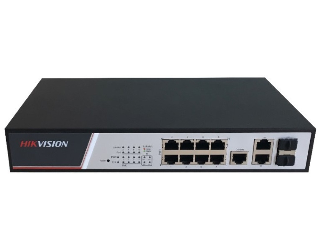 | 8-портовий керований POE/POE+ комутатор; Downlink порти: 8x RJ45 (10/100M) із підтримкою PoE; Uplink порти: 2x Combo (10/100/1000M); пропускну здатність 10 Гбіт/с; Протокол PoE: IEEE 802.3AF/AT, бюджет 125 Вт; 4K VLAN; GVRP; QinQ; Private VLAN; Живлення: AC 100-240В; 0? до +50?C; 280?179?45 мм |