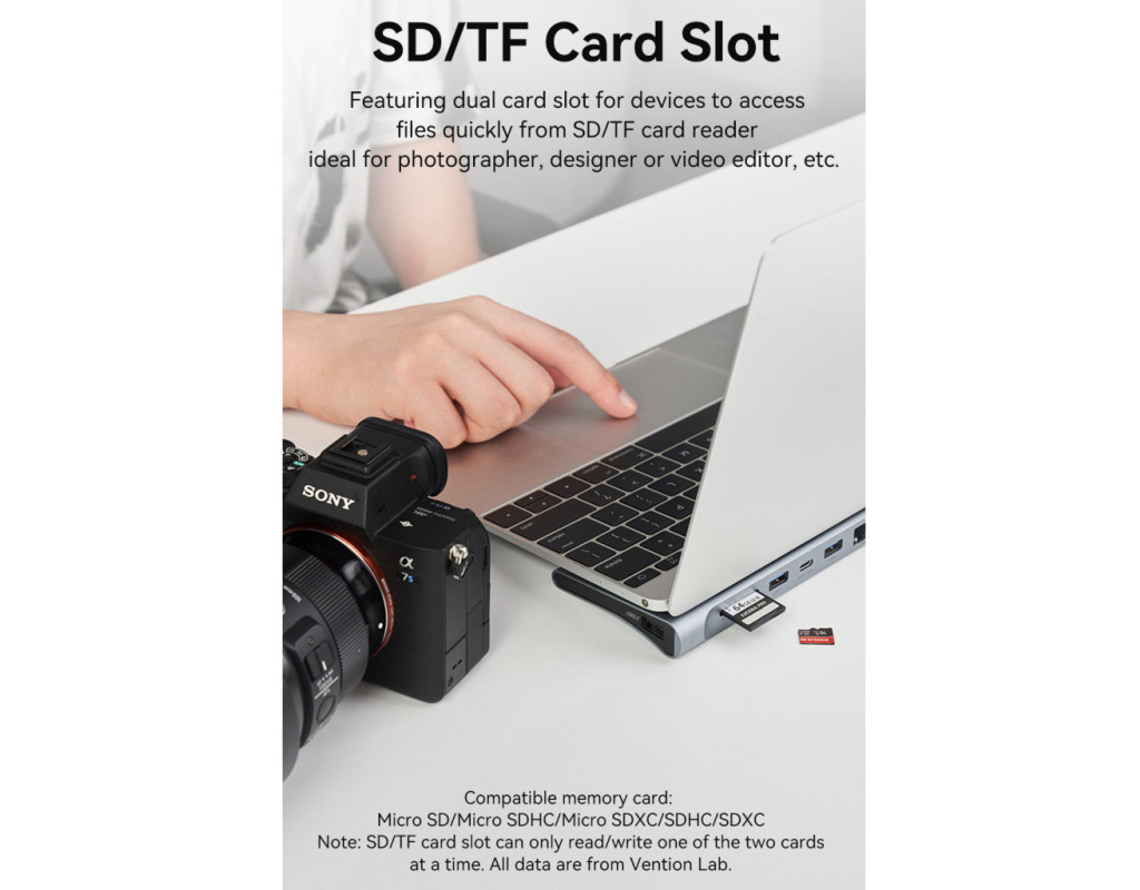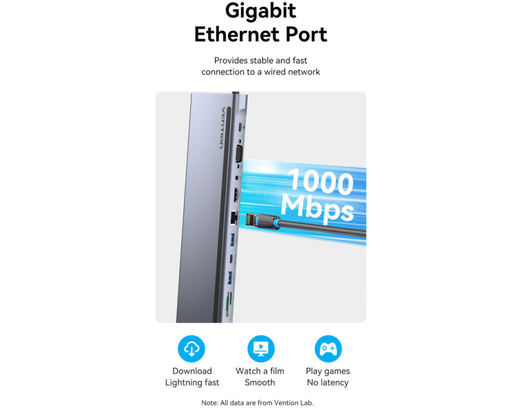 Багатофункціональна USB-C док-станція 11-in-1 Vention THTHC здатна значно розширити можливості вашого ПК, ноутбука чи смартфона. Підключайте ноутбук до телевізора через інтерфейс HDMI та відтворюйте зображення з роздільною здатністю до 4K UHD. Беріть док-станцію на бізнес-конференції та демонструйте презентації через проектор – у цьому допоможе інтерфейс VGA. З’єднюйтесь з локальною мережею через порт Gigabit Ethernet та ефективно працюйте в офісі, грайте в ігри, дивіться фільми. Три порти USВ Type-A дозволяють підключити необхідне для роботи обладнання, таке як комп’ютерна миша, клавіатура, принтер, флешка та інші USВ пристрої. Два порти USВ 3.0 підтримують швидкість обміну даними до 5 Гб/с Док-станція Vention THTHC також оснащена двома портами USB Type-C, один з яких здійснює зарядження підключеного пристрою з максимальною потужністю 100 Вт. Ви зможете зарядити MacBook Pro до 100% за 1,5 години. Слоти для читання SD/TF карт забезпечують передачу відео, фотографій та аудіофайлів. Використовуйте аудіопорт 3,5 мм для підключення навушників чи колонок та насолоджуйтесь улюбленою музикою. Док-станція Vention THTHC також може використовуватися в якості підставки для ноутбука, кут нахилу 7 градусів сприятиме кращій циркуляції повітря та охолодженню ноутбука. Корпус док-станції виготовлений з алюмінієвого сплаву, який ефективно відводить тепло з її внутрішніх компонентів та запобігає її нагріванню навіть при максимальних навантаженнях. Док-станція Vention THTHC підтримує функцію Plug and Play. Для початку роботи вам не доведеться встановлювати додаткові драйвери - просто підключайтесь до комп’ютера і працюйте. Док-станція сумісна з операційними системами Windows 11/10/8/7/Vista/XP, Linux, iOS, Android OS та Mac OS. |