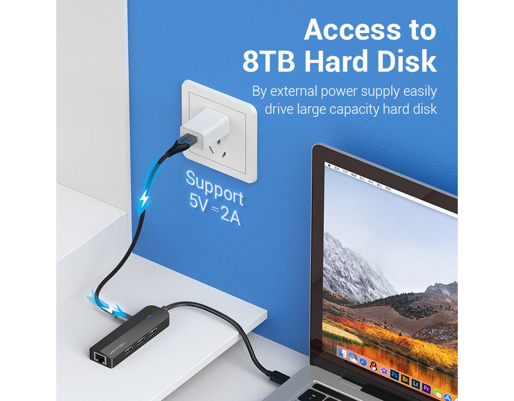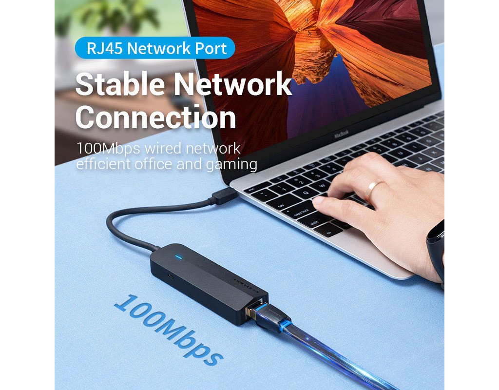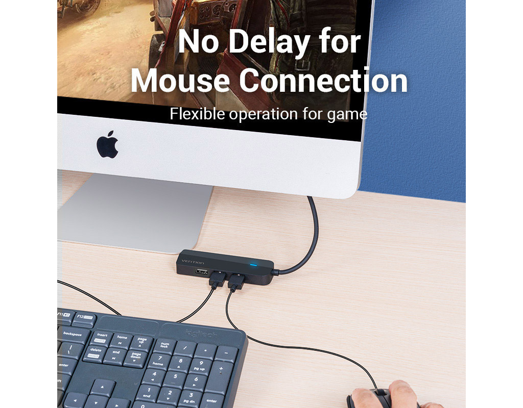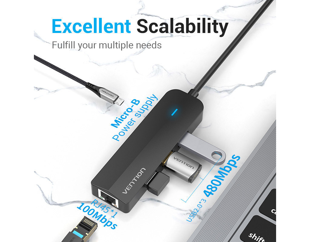 Хаб USB 3.1 Type-C Vention TGOBB перетворить один з портів вашого USB-С пристрою на три порти USB-A зі швидкістю передачі даних до 480 Мб/с. Ви зможете одночасно під’єднати до нього клавіатуру, мишу, флеш-накопичувач тощо. Порт RJ-45 дозволить встановити з’єднання з локальною мережею. Ефективно працюйте в офісі, переглядайте плавне відео, грайте в он-лайн ігри без затримок, швидко завантажуйте файли великих об’ємів. Використовуйте роз’єм MicroUSB для додаткового живлення концентратора з силою струму до 5 В/2 А та підключайте до нього диски HDD об’ємом до 8 ГБ або заряджайте одночасно до 2 мобільних пристроїв. Хаб USB 3.1 Type-C Vention TGOBB підтримує підключення Plug and Play. Для початку роботи вам не доведеться встановлювати додаткові драйвери. Про стан підключення сповіщатиме світлодіодний індикатор. Хаб сумісний з операційними системами Windows 10/8/7/Vista/XP, Linux та Mac OS. |