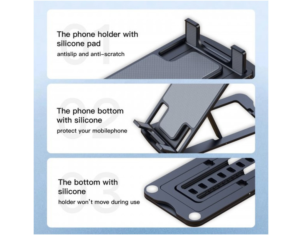 - Стабільний та міцний: кронштейн з алюмінієвого сплаву та протиковзна металева основа роблять цей тримач телефону більш стійким та довговічним. Силіконова підставка преміум-класу та силіконові накладки на дні захищають як телефон, так і підставку від ковзання та подряпин.