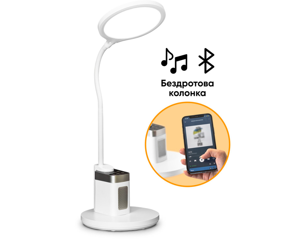Стиль - модерн, Вид лампи - функціональні, Тип лампи - LED-стрічка, Кріплення - підставка, вбудована (незамінна), Вимикач - сенсорний, ні, так, Особливості - годинник, бездротова колонка, гнучка ніжка, Матеріал - пластик, Колір - білий