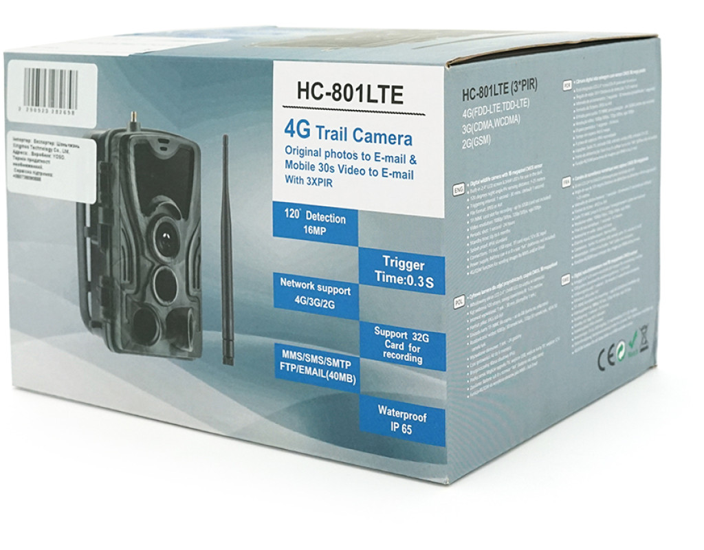 | Фото-відео Пастка 3 датчика руху Кут огляду камери 120 градусів Роздільна здатність фото 16 мегапікселів Роздільна здатність відео 2 мегапікселя Налаштування надсилання повідомлення MMS / FTP / SMTP Слот під карту SD 64GB MAX Живлення 8 х АА DC 6-12V 1 A Підтримка стандартів зв`язку 4G / 3G / 2G Інформація на фото – Дата / час / температур День / Ніч – Кольорова / Чорно-Біла Дисплей-TFT 2.4” Дистанція виявлення руху 1-25 метрів Інфрачервоне підсвічування – до 27 метрів кількість ІЧ діодів – 36 штук Розміри 135х90х76мм Ступінь захисту -IP67 Робоча температура – 30 + 50 |