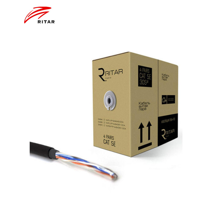 Кабель мережевий Ritar UTP 305м КНП (4 * 2 * 0,51) [СCA] ПВХ + ПЕ, зовнішній (3495) для зовнішньої прокладки в телефонній каналізації, в колекторах, шахтах, по стінах будівель. Експлуатується при частотах до 100 МГц. Особливості кабелю: струмопровідна жила: CCA, діаметр: 0,5 мм / 0.51мм (24 AWG); ізоляція: поліетилен, діаметр провідника: 0,92 мм; пара: 2 скручених разом провідника, зовнішня оболонка: світлостабілізований поліетилен (PE) + ПВХ; колір оболонки: чорний, максимальні розміри кабелю: 6.7 мм. |