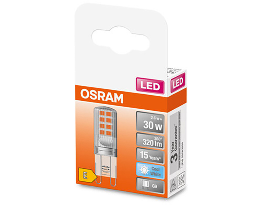 Osram LED PIN30 2.6W/840 230V CL G9 (4058075432369) — це компактна світлодіодна лампа, призначена для заміни традиційних галогенних ламп з цоколем G9, яка відрізняється низьким енергоспоживанням і тривалим терміном служби. Основні характеристики: