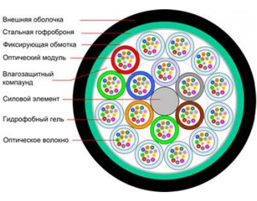 Призначення: Для прокладки в кабельній каналізації та трубопроводах, на мостах і естакадах, у тунелях, колекторах при введенні в будівлю, в тому числі в місцях, заражених гризунами, в легких грунтах (без мерзлотних деформацій), а також по зовнішніх стінах будівель і споруд. Конструкція: Кабель може містити від 5 до 24 оптичних модулів, навитих навколо центрального силового елемента, в яких може розташовуватися до 288 оптичних волокон. Оптичний кабель FinMark LTxxx-SM-05 являє собою полегшену модифікацію конструкції LТxxx- SM-04, що дозволяє закласти до 96 волокон в кабель зовнішнім діаметром до 12 мм. Усередині модулів знаходиться гідрофобний гель. У кабелі з малою кількістю волокон, замість відсутніх оптичних модулів застосовуються т.зв. «заповнюючі» модулі. Простір між модулями заповнений водоблокуючим компанундом. Поверх сердечника кабелю накладена броня з сталевої гофрованої стрічки, яка, крім механічного захисту, служить гідробар’єром, що перешкоджає дифузії вологи через полімерні оболонки в сторону оптичного волокна. Зовнішня оболонка виготовлена з УФ-стабілізованого поліетилену високої щільності. |