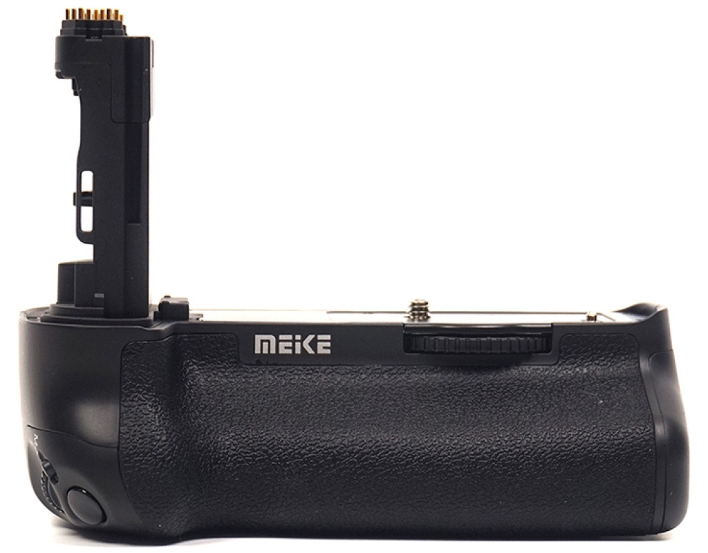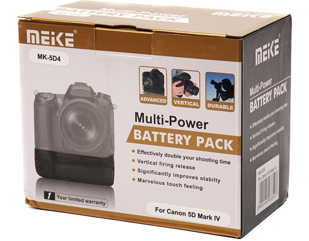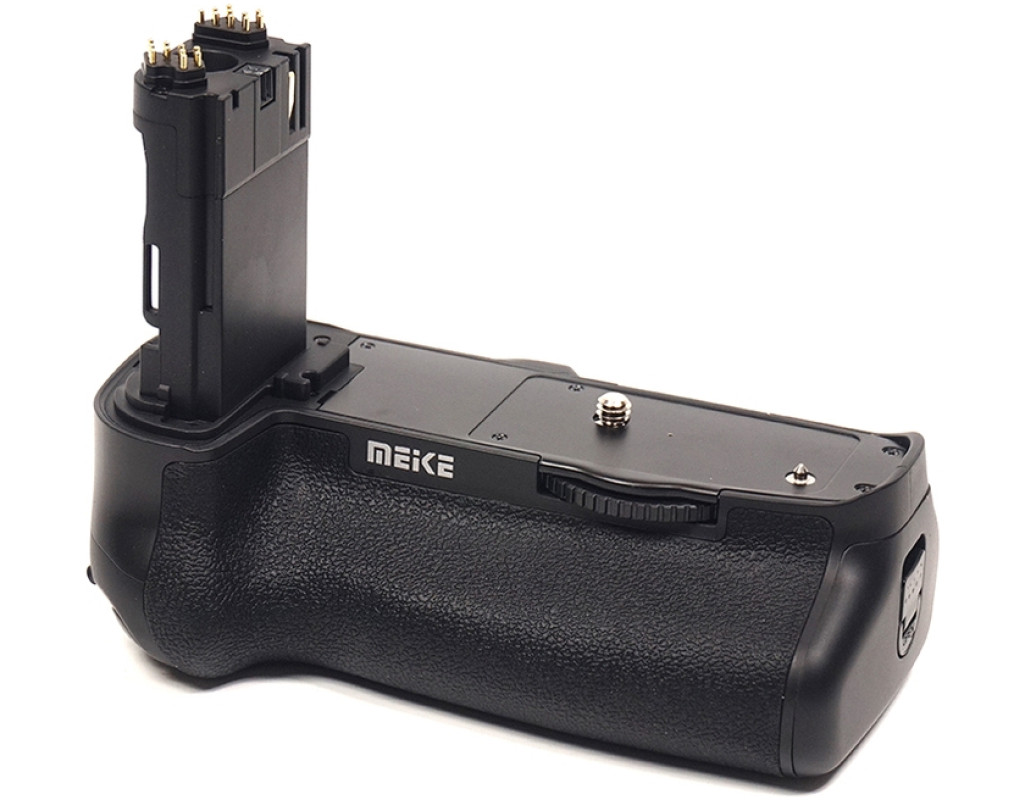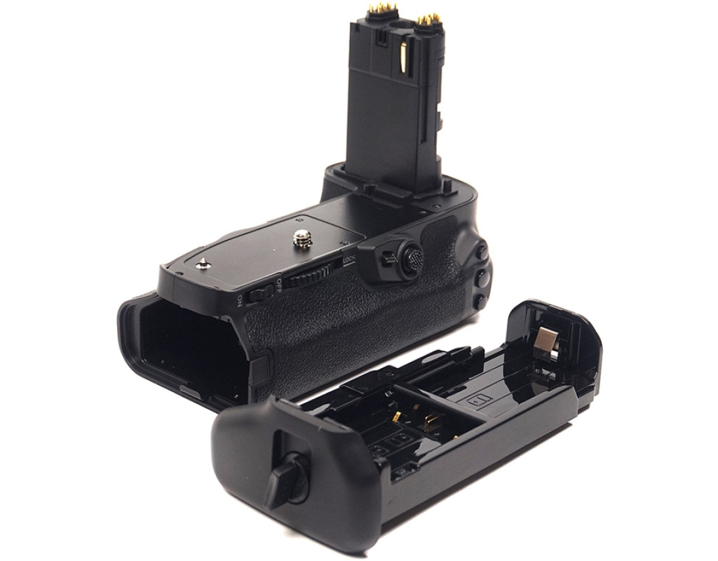 Батарейний блок Meike Canon 5D Mark IV для фотоапаратів Canon. Корпус акумуляторного блока та прогумовані вставки мають ту ж фактуру, що й фотоапарат, завдяки чому не порушується загальний вид. Ергономічна конструкція ручки батарейного блока дає змогу більш зручно тримати фотокамеру під час знімання у вертикальному положенні. Як джерело живлення блоку Canon використовуються дві спеціальні акумуляторні батареї LP-E6. Для зручності знімання вертикальних кадрів на ручці розташовані додаткова спускова кнопка затвору, кнопки АЕ lock/FE lock/AF point selection, кнопка включення автофокусу, а також диск керування. Є вбудований роз'єм для кріплення штатива. Батарейний блок для Canon незамінний для фоторепортерів, фотографів на весіллях, яким дуже важливо не проґавити гарний кадр через розряджений акумулятор. Крім того, камери Canon EOS 5D Mark IV з батарейним блоком мають набагато солідніший вигляд. Комплект постачання: