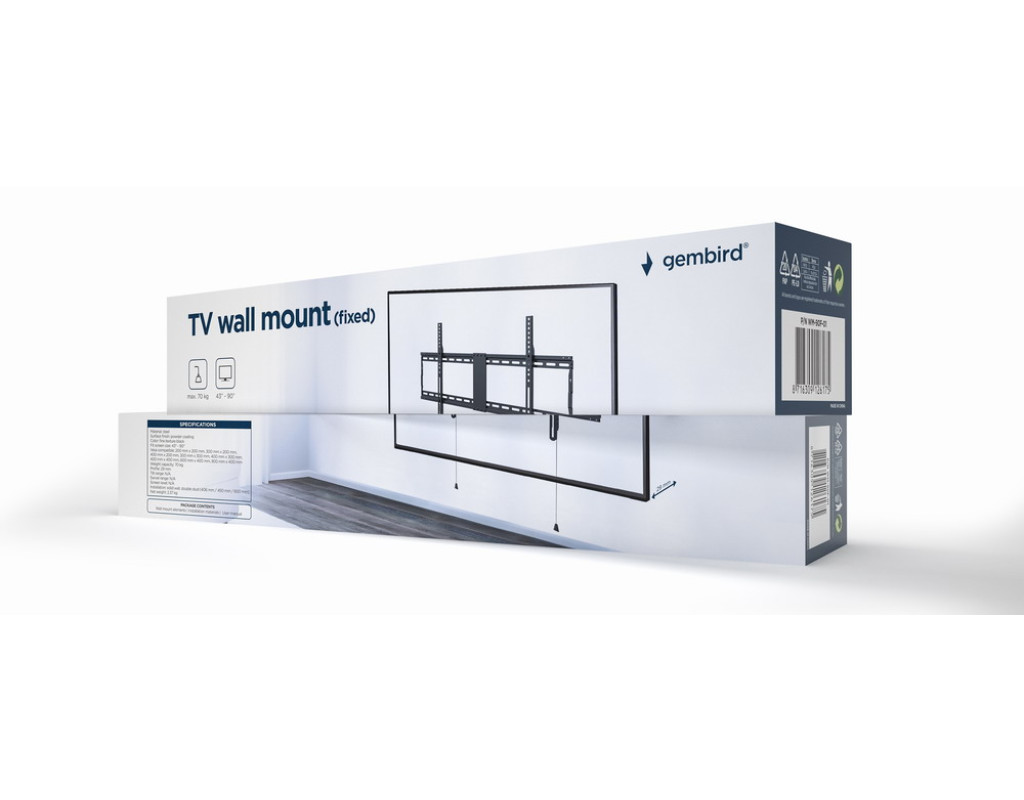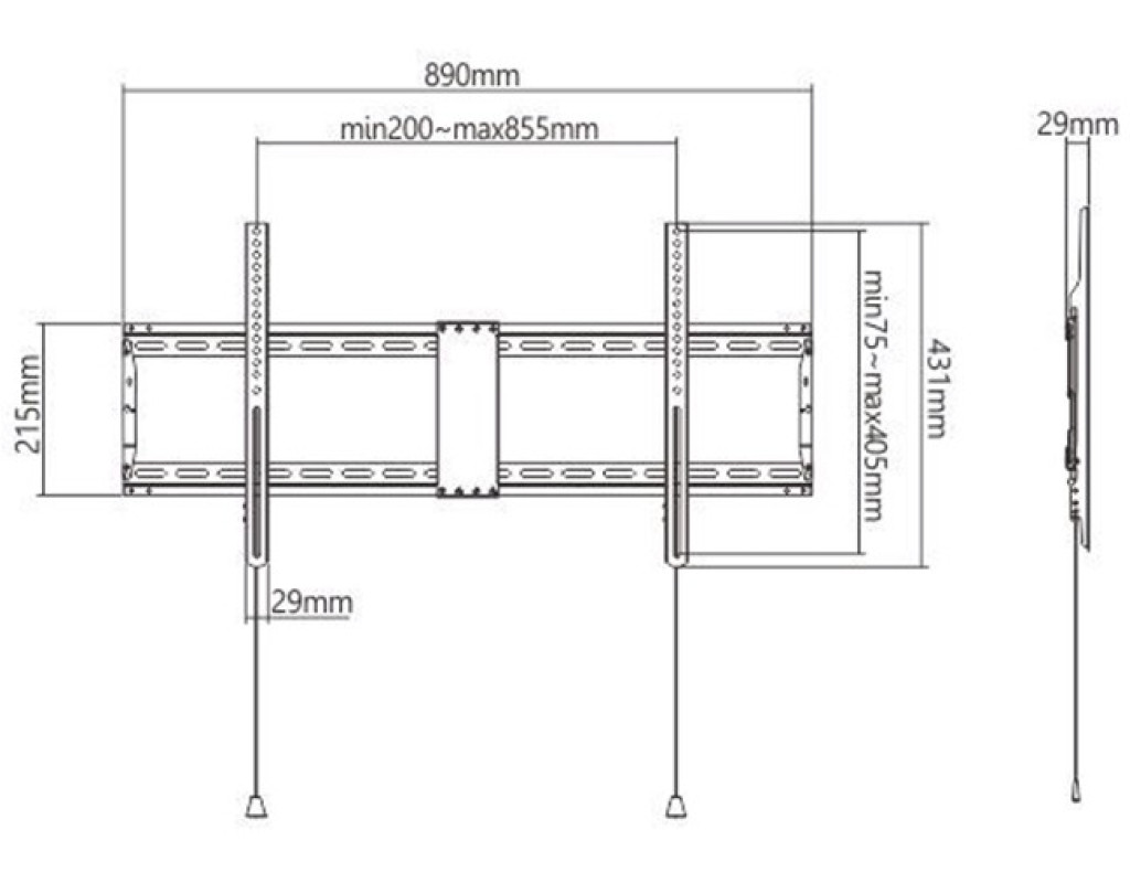 Надпотужний сталевий фіксований настінний кронштейн для РК-екрана. Підтримує більшість РК-телевізорів з діагоналлю екрана від 43 до 90 дюймів. Автоматичні пружинні замки зі швидкознімними шнурами для легкої установки. Сумісність із VESA, макс. 800 мм х 400 мм. Відстань до стіни: 29 мм. Включає всі необхідні монтажні матеріали. |