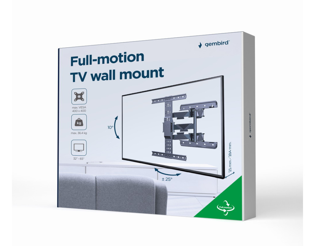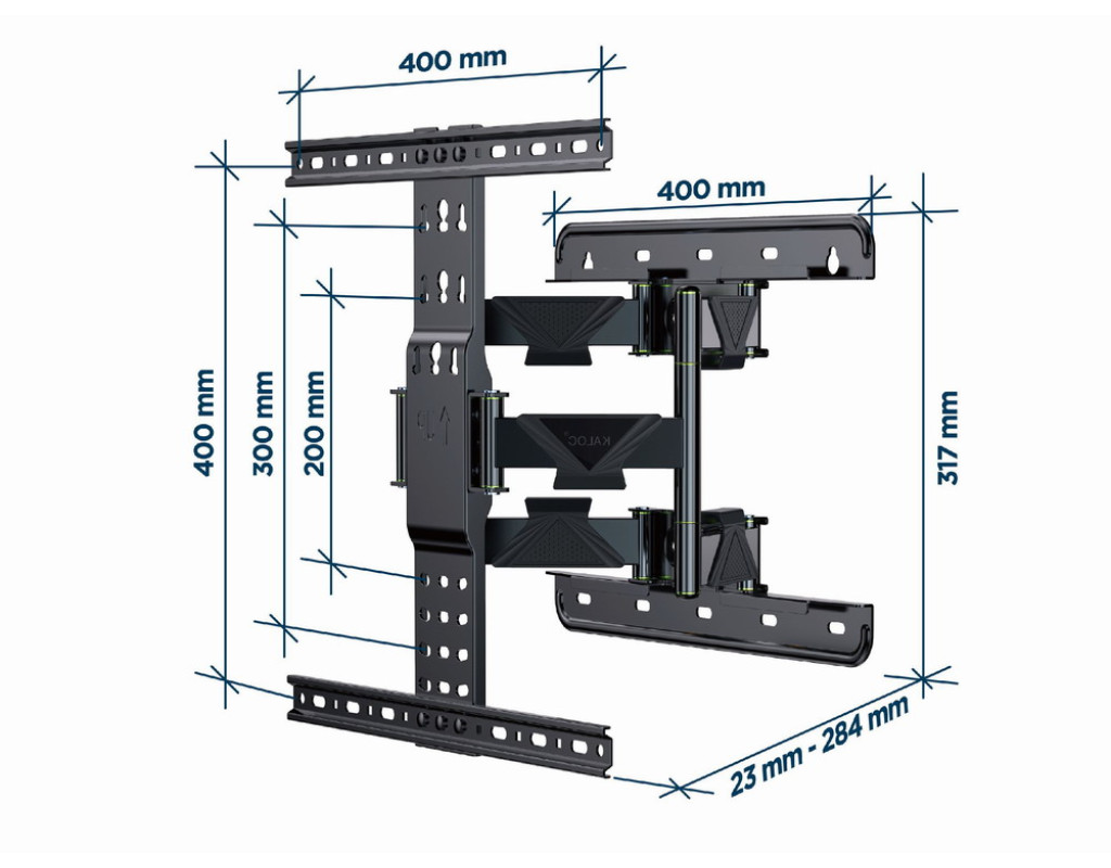 Підтримує більшість LCD/LED-телевізорів з діагоналлю 32-65 дюймів Сумісність із VESA, макс. 400 мм х 400 мм Відстань від стіни 23-284 мм Дозволяє повертати на 50 градусів та нахиляти на 10 градусів Практичні кріплення для кабелю У комплект входять усі необхідні монтажні матеріали |