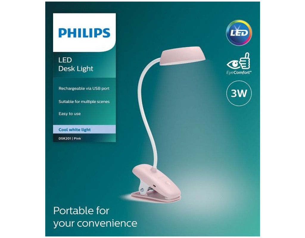 | Лампа настільна Philips LED Reading Desk lamp Donutclip, 3w, 4000K, 1200mAh (Lithium battery). Лампа для читання зі вбудованою літієвою батареєю для більшої зручності. Комфортне світлодіодне світло, яке приємне для очей. Живлення та зарядка через порт USB. М'яка гусяча шия Silence для перенаправлення світла. Сенсорна клавіша для 3-рівневого затемнення. Розсіювач у формі Votex для рівномірного розподілу світла. Більша товщина утримання завдяки силіконовій гумовій шайбі проти ковзання. |