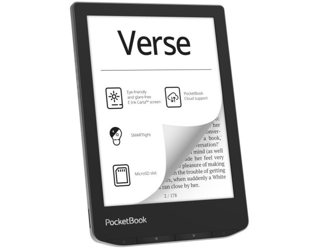 PocketBook Verse: нове покоління легкості та зручності читання PocketBook анонсує надзвичайно зручний, компактний і легкий 6-дюймовий рідер PocketBook Verse, що має все необхідне для комфортного читання. Новий PocketBook Verse оснащений безпечним для очей сенсорним екраном E Ink Carta™, має адаптивне підсвічування SMARTlight і слот для карт пам’яті microSD, а також підтримує PocketBook Cloud. Рідер поєднує елегантний та лаконічний дизайн із привабливими кольорами Bright Blue або Mist Grey. Безпечний для очей, як друкована сторінка PocketBook Verse — ідеальний компаньйон для завзятих читачів. Завдяки 6-дюймовому сенсорному HD екрану E Ink Carta™ читати зручно та приємно. Високоякісний дисплей дарує комфорт, максимально подібний до читання з паперу, забезпечуючи години читання без напруги очей чи втрати концентрації. Попрощайтеся з відблисками на яскравому сонячному світлі, адже E Ink дисплей рідера дозволяє читати будь-де та будь-коли. Його ідеальна чіткість і читабельність немов оживляють кожне слово на сторінці. Більше свободи з адаптивним SMARTlight Відчуйте неперевершений комфорт читання з PocketBook Verse, створеним, щоб бути під рукою і вдень і вночі. Завдяки технології SMARTlight, користувачі можуть адаптувати параметри дисплея до будь-яких умов освітлення, регулюючи яскравість та колірну температуру екрана. Тепер ви можете легко налаштувати колірний тон сторінки, не відриваючись від читання – просто проведіть пальцем уздовж краю дисплея. Ви також можете зберегти бажані шаблони налаштувань екрана та активувати їх пізніше, щоб насолоджуватися персоналізованим читанням у будь-який час. Читання без обмежень з підтримкою 25 форматів PocketBook Verse підтримує 25 книжкових і графічних форматів, включаючи ACSM, AZW, CBZ, DJVU, DOC, EPUB, FB2, PDF, TXT, JPEG і PNG, тому більше не потрібно конвертувати ваші файли. З PocketBook читачі зможуть забути про проблему конвертації файлів і заощадять свій дорогоцінний час. А завдяки підтримці Adobe DRM, рідер дозволяє користуватись сервісами онлайн-бібліотек. Позичати книги онлайн ще ніколи не було так просто! Слот для карти пам'яті й місяць читання на одному заряді З PocketBook Verse у вас ніколи не вичерпаються варіанти читання. Пристрій має 8 ГБ вбудованої пам’яті, що забезпечує достатньо місця для зберігання кількох тисяч книг у вашому рідері. Verse також має слот для карти пам’яті до 128 ГБ, що дозволяє розширити вашу віртуальну бібліотеку до 60 тисяч електронних книг, залежно від формату та якості кожного завантаженого файлу. Рідер також відрізняється енергоефективністю: один повний заряд забезпечує до місяця активного читання. Чудове поєднання комфорту та стилю PocketBook Verse — компактний пристрій, що важить лише 182 г і легко поміщається у наплічнику чи сумочці. Завдяки ідеальному поєднанню механічних кнопок керування та сенсорного екрана, рідер забезпечує просту навігацію та комфортний досвід читання. Створений, щоб вражати, Verse може похизуватись елегантним і лаконічним зовнішнім виглядом, який доповнить будь-який стиль. Його мінімалістичний дизайн і привабливі кольори Bright Blue чи Mist Grey зможуть додати нотку витонченості вашому щоденному читанню. Більше можливостей з безкоштовними словниками та хмарними сервісами Завдяки вбудованому Wi-Fi, PocketBook Verse пропонує швидкий доступ до онлайн-книгарень, дозволяючи вам легко шукати та купувати книги з різних джерел. Управляйте вашою бібліотекою та синхронізуйте файли між д