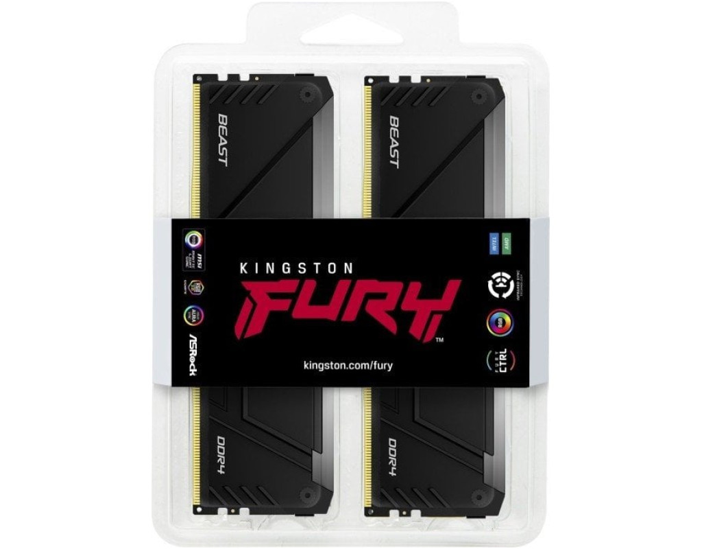 Світлодіодна лінійка по верхній кромці всього модуля пам'яті може керуватися фірмовим програмним забезпеченням Kingston FURY CTRL*, а також спеціалізованим програмним забезпеченням, що постачається в комплекті материнських плат, що підтримують управління світловими ефектами: ASUS Aura Sync, Gigabyte RGB Fusion та MSI Mystic Light Sync. При встановленні модулів пам'яті Kingston FURY Beast RGB DDR4 в плату, що не підтримує управління, включається режим хвилеподібного підсвічування, при якому вздовж лінійки, що світиться, циклічно проходять хвилі зміни кольору підсвічування. Для запобігання розсинхронізації динамічних світлових ефектів у пам'яті Kingston FURY Beast RGB DDR4 застосована технологія синхронізації підсвічування з передачею сигналів керування по інфрачервоному каналу — всі модулі, встановлені в материнську плату поруч один з одним, тепер переливаються синхронно, незалежно від наявності або відсутності зовнішнього управління. Таке рішення дозволило зберегти цілісність дизайну моддерського ПК, так і уникнути використання додаткових проводів. Живиться підсвічування безпосередньо від слота для пам'яті. Проста в установці і на більшості систем оперативна пам'ять, що настроюється включенням XMP профілю, дозволить швидко і без додаткових складнощів отримати максимум продуктивності від ПК. Завдяки стильному радіатору з RGB-підсвічуванням пам'ять Kingston FURY Beast RGB DDR4 виглядає естетично, зберігаючи при цьому ефективне тепловідведення. Усі модулі пам'яті Kingston FURY Beast RGB DDR4 проходять обов'язкове заводське тестування на заявленій швидкості та забезпечені довічною гарантією. Особливості Kingston FURY Beast RGB: