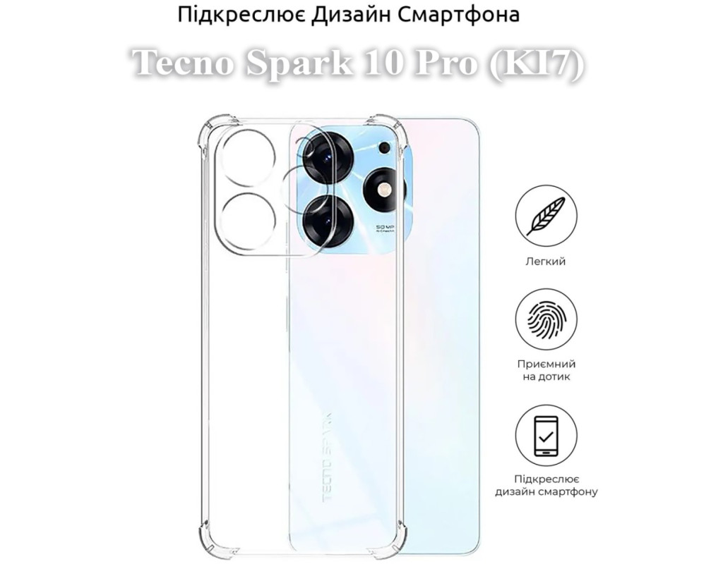 сумісність з моделями - Tecno Spark 10 Pro, Тип чохла для телефону - накладка, Призначення - модельний, Колір - прозорий