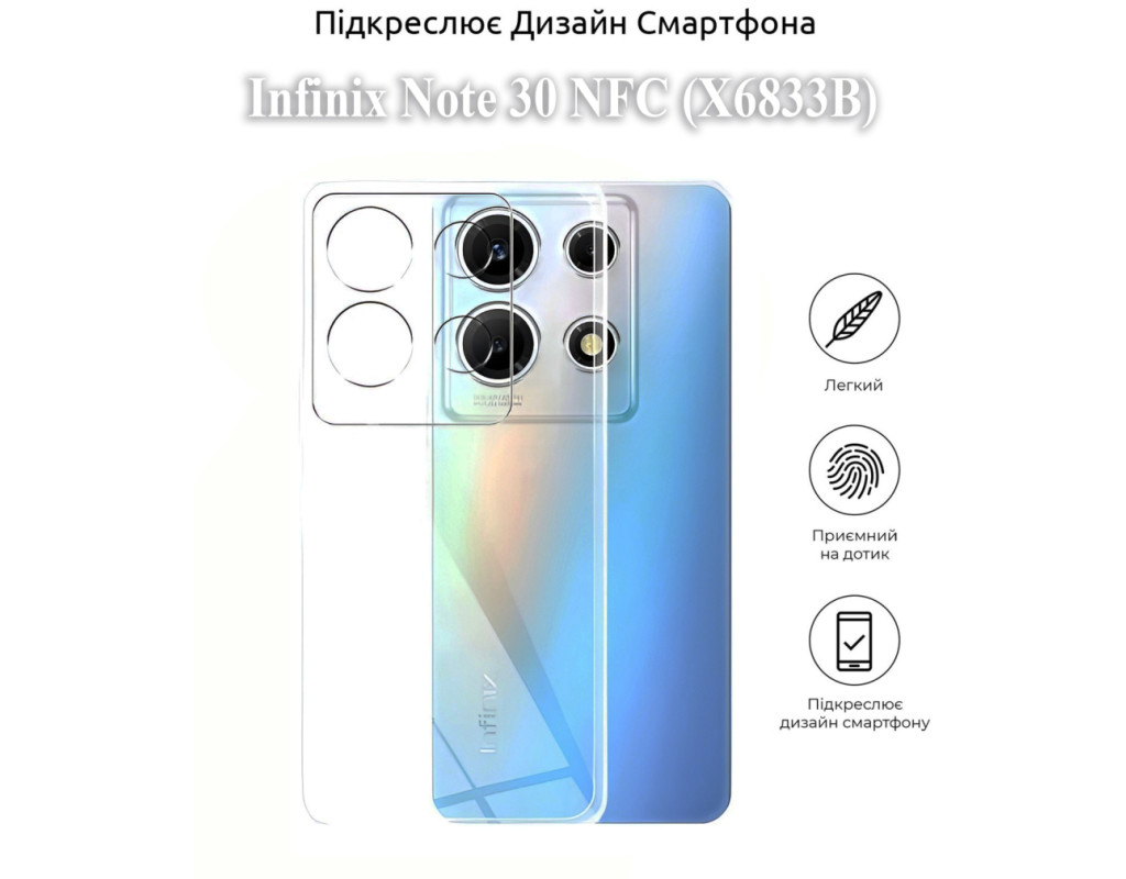 сумісність з моделями - Infinix Note 30 NFC, Тип чохла для телефону - накладка, Призначення - модельний, Колір - прозорий