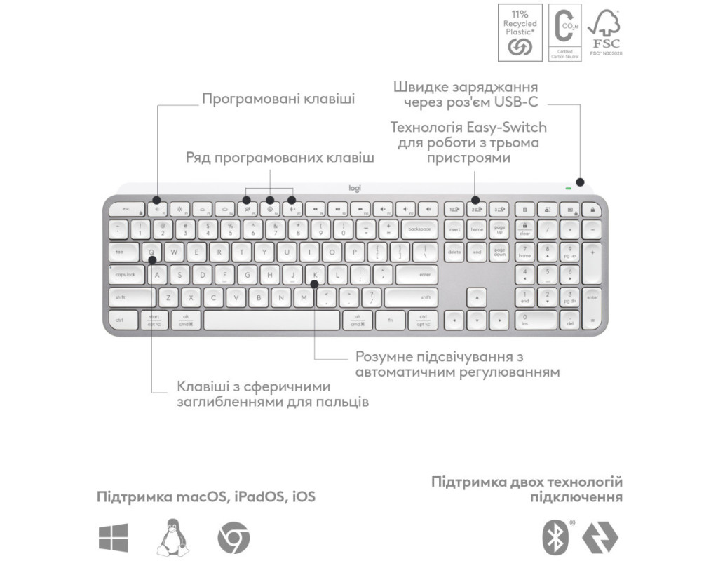 | Оволодійте своїм робочим потоком, як ніколи раніше, завдяки MX Keys S - бездротовій клавіатурі з низьким профілем, яка пропонує швидкий, плавний та точний досвід набору тексту, розумне підсвічування та налаштовуванні функції Smart Actions, що заощаджують час. MX Keys S також має розумну підсвітку, яка вмикається, коли ваші пальці наближаються до клавіатури, і автоматично змінює яскравість відповідно до часу доби. Тепер ви маєте більше контролю над яскравістю та тривалістю підсвічування за допомогою програми Logi Options+. |