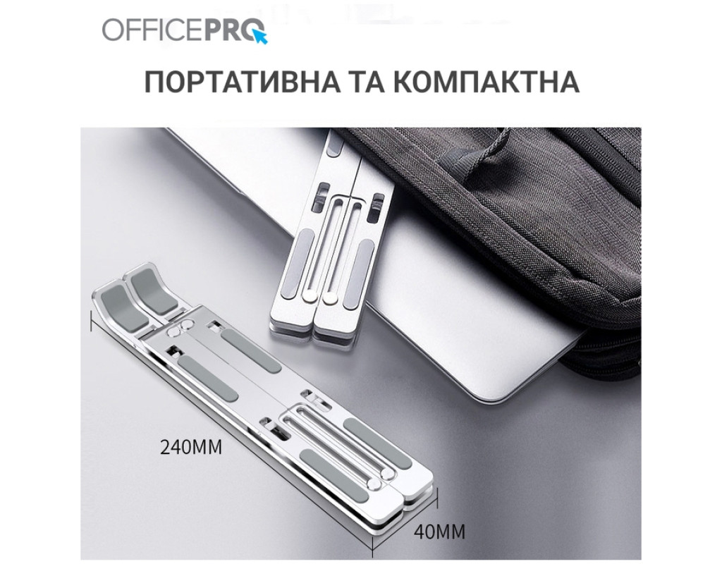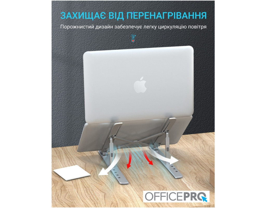 Компактна, стильна та стабільна підставка для ноутбука OfficePro зробить роботу за ноутбуком зручнішою та забезпечить пристрій від перегріву. Ідеально впишеться в будь-який інтер'єр і гармонійно компонуватиметься з будь-яким пристроєм по дизайну. Характеристики: