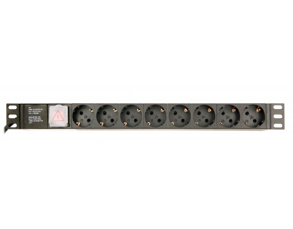 Професійний модуль живлення з алюмінію Ідеально підходить для застосування в серверних приміщеннях 8 вихідних євро-розеток Шторки безпеки Можливість установки в стійку 1U |