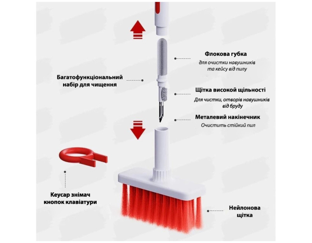 Набір для чищення гаджетів та електроніки XoKo Clean set 001 Роздільний дизайн із двома головками: Clean set 5-в-1 набір для чищення комп'ютера з нейлоновою щетиною, флокуюча губка високої щільності щітка, металевий наконечник пера та Keycap знімач, подвійною головкою