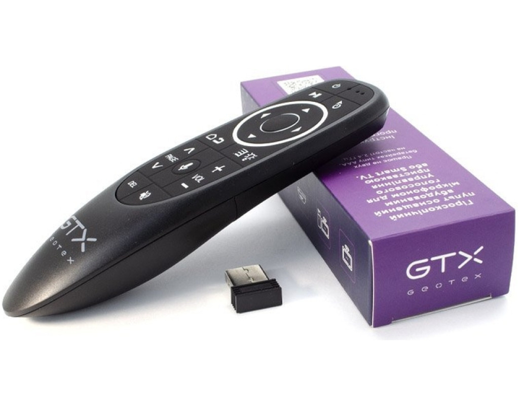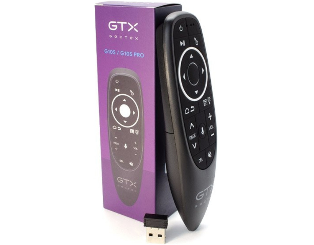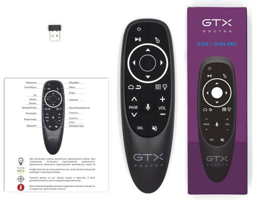 Geotex G10S Pro це нова модель гіроскопічного пульта від відомого виробника. Оновлений Geotex G10S Pro оснастили підсвічуванням клавіш для зручного використання пристрою в нічний час доби. Гіроскопічний пульт має вбудований мікрофон для голосового управління з підтримкою голосового асистента від Google. Це дозволяє користуватися пошуком і введенням повідомлень голосом, без клавіатури. Також важливою особливістю є програмована кнопка для включення телевізора або іншого пристрою. Програмується 1 кнопка ввімкнення. Управління пультом реалізовано за допомогою передачі рухів руки, якi передаються курсору на екрані. Завдяки цьому досить легко керувати пристроєм рукою, щоб точно і швидко перемістити курсор в потрібну точку на моніторі. А ергономічна форма пульта дистанційного керування не дозволить втомитися від взаємодії з гаджетом. Geotex G10S Pro використовує бездротовий стандарт 2.4G, який працює на відстані до 10 метрів від пристрою. Для підключення в комплекті присутній USB передавач компактних розмірів, який потрібно підключити до ТБ, медіаплеєра, персонального комп’ютера, приставки або іншого підтримуваного пристрою. Пульт живиться від 2 батарейок типу ААА. Виконаний Geotex G10S Pro з високоякісних матеріалів в класичному чорному кольорі з білим підсвічуванням клавіш. Гіроскопічний пульт може працювати з медіаплеєрами, ПК, ноутбуками, телевізорами та іншими пристроями з USB адаптером та підтримкою аксесуарів. Інструкція для програмування кнопки на пультi Geotex G10S Pro: