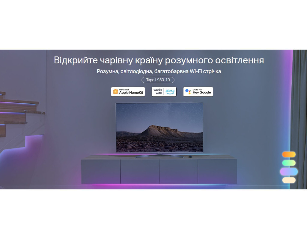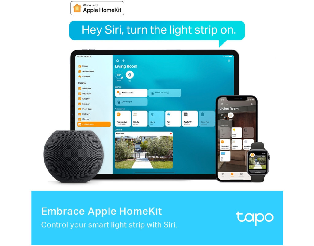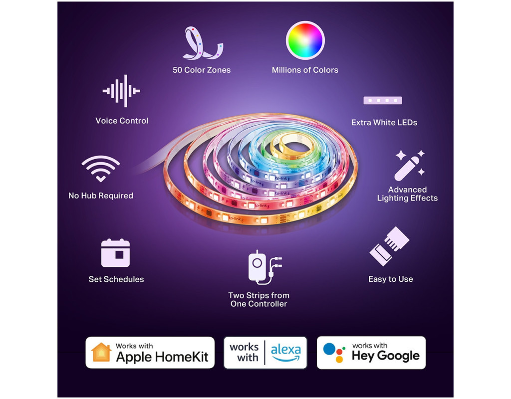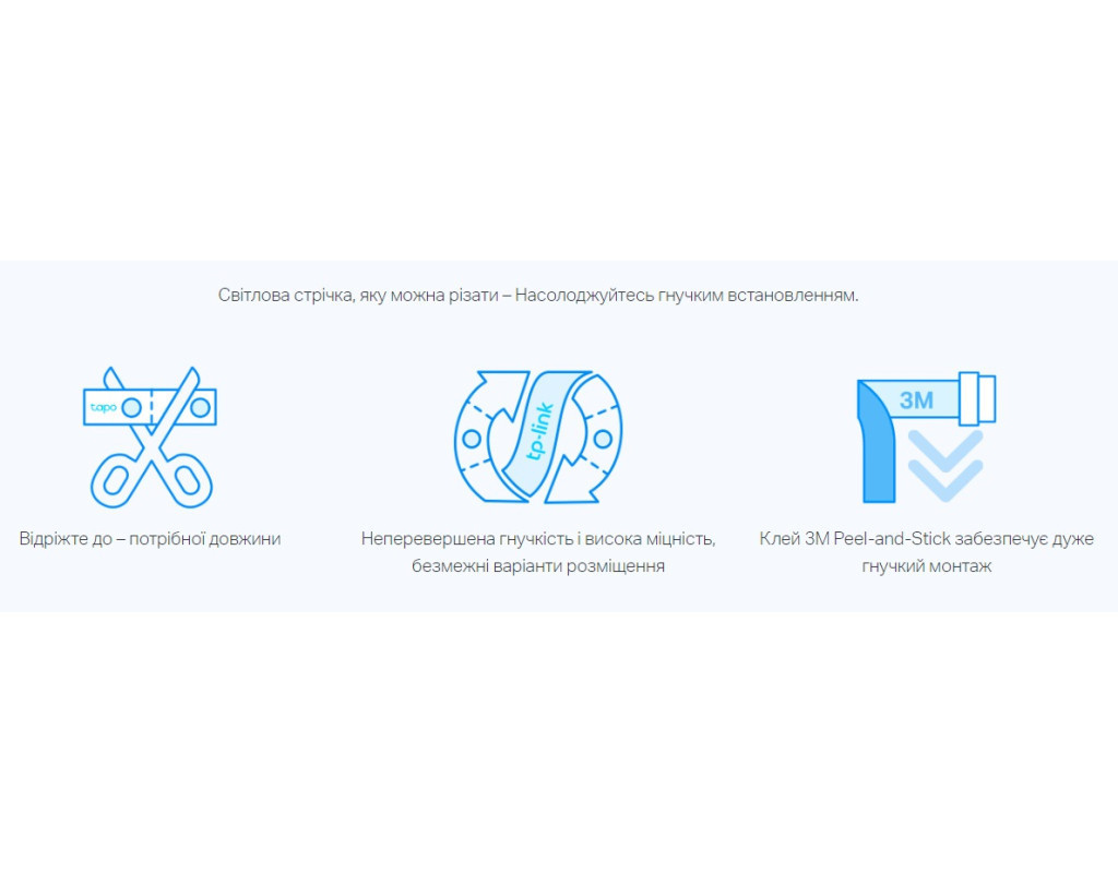 Додатково додані білі світлодіоди по всій довжині світлової стрічки, випромінюють біле світло. Це робить Tapo L930 універсальним приладом, який служить для різноманітних цілей освітлення. 50 Кольорові сегменти для зонального контролюПроявіть свою уяву, щоб встановити 50 окремих кольорових зон або дозвольте йому сяяти відповідно до ваших мінливих настроїв. Скористайтеся Apple HomeKitБудучи першою світловою стрічкою Tapo, яка підтримує Apple HomeKit, вона дозволяє користувачам керувати нею з кількох пристроїв за допомогою простих голосових команд. Спробуйте керувати своїм розумним будинком за допомогою Siri. Ультрадовга світлова стрічка, відповідна вашому просторуЯкщо він має більшу довжину, він дозволяє розширити чарівні вогні до будь-якого простору, якому ви хочете додати яскравості. Керуйте двома частинами L930 одночасно, використовуючи один контролер. Кришталево, Гнучко та ЧистоTapo L930 генерує м’яке світло через прозоре зовнішнє поліуретанове покриття. Його легко прикріпити як завгодно. Високотехнологічне покриття добре захищає всі світлодіоди та полегшує обслуговування. Розвивайте почуття за допомогою функції Music SyncСвітлодіодна стрічка фіксує музику, що лунає, синхронізуючи її з частотою та ритмом. Слідкуйте за ритмом й проявіть всі свої емоції на вечірці! Легко контролюватиПопросіть розумні динаміки — Apple HomePod Mini, Amazon Alexa та Google Assistants — виконувати ваші голосові команди, не заважаючи виконувати поточні завдання вдома. Отримайте досвід «розумного дому» без рук. Заплануйте щоденні діїВикористовуйте програму Tapo, щоб запланувати ввімкнення/вимкнення світлової смуги з установленими вами яскравістю, відтінком і ефектами та координувати освітлення з будь-якою подією, яку ви проводите. Довільно підбирайте довжинуСвітлова стрічка, яку можна різати – Насолоджуйтесь гнучким встановленням.