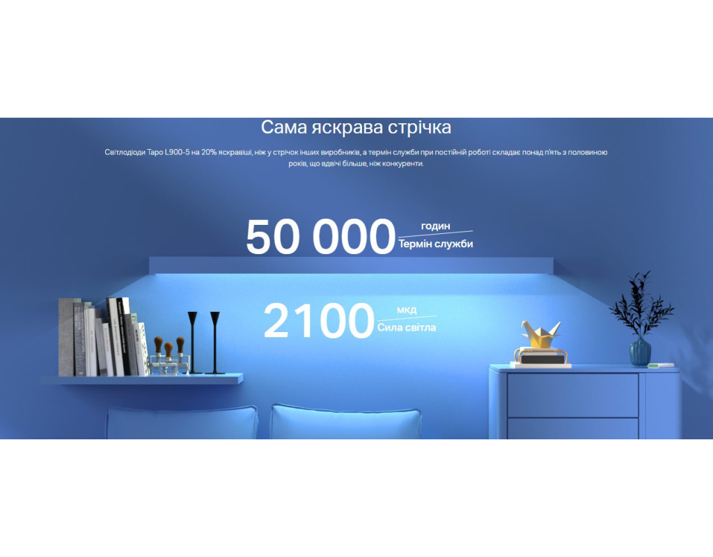 Світлодіоди Tapo L900-10 на 20% яскравіші, ніж у стрічок інших виробників, а термін служби при постійній роботі становить понад п'ять з половиною років, що вдвічі більше, ніж у конкурентів. Освітлення для будь-яких сценаріївЗалежно від настрою виберіть один із 16 мільйонів відтінків, включаючи тепле біле або холодне денне світло. Після того, як визначитеся з параметрами освітлення, збережіть їх, створіть розклад — і готово! Унікальне освітленняВстановіть для різних стрічок індивідуальні параметри, такі як колір, час роботи, яскравість та теплота. Керуйте ними де і коли завгодно через програму Tapo. СвітломузикаПориньте в музику разом із освітленням. Виберіть пісню на мобільному пристрої та створіть ідеальну атмосферу для вечірки. Освітлення змінюватиметься в залежності від темпу та ритму музики, створюючи якийсь міні-фестиваль прямо вдома. Голосове керуванняL900-10 підтримує голосове управління через Google Асистента, Amazon Alexa та Apple Home. Повний контрольКеруйте світлодіодною Wi-Fi стрічкою через програму Tapo. АвтоматизаціяСвітлодіодна стрічка допоможе не спіткнутися вночі. Підключіть стрічку до датчика Tapo, щоб при виявленні руху в нічний час вона тихенько загорялася, а потім після деякого часу сама відключалася. КонтроллерКеруйте світлодіодною стрічкою за допомогою фізичного контролера: вмикайте та вимикайте стрічку, скидайте її налаштування до заводських та змінюйте її колір. З турботою про сім'юПродукти Tapo безпечні у використанні. Світлодіодна стрічка L900-10 краще розсіює тепло, довше служить і стійка до більшої кількості вигинів, ніж будь-яка інша світлодіодна стрічка. Всі світлодіоди працюють незалежно один від одного під низькою напругою, а також вони не мерехтять і не випромінюють блакитне світло — все на благо сім'ї. Підберіть довжину та приклейте