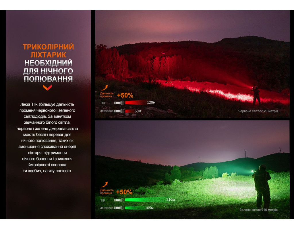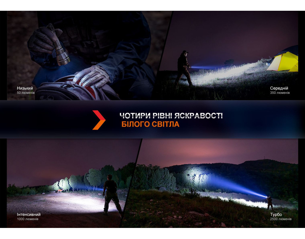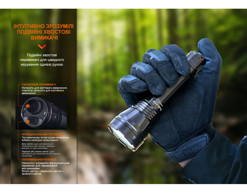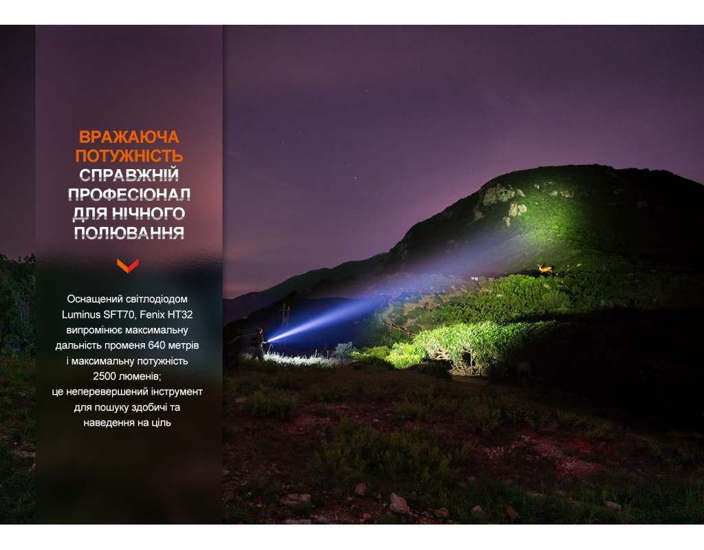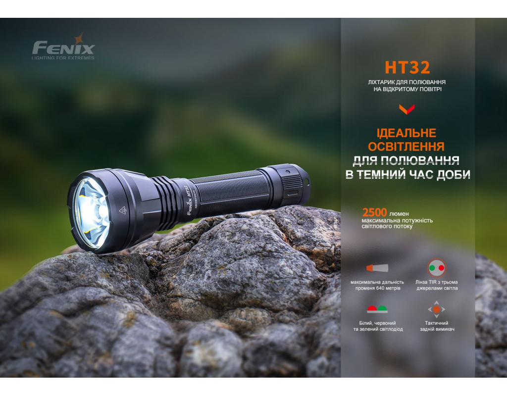 | Ліхтар Fenix HT32 — це втілення надійності та інновацій, призначене для справжніх професіоналів та ентузіастів активного відпочинку. Завдяки використанню сучасного джерела світла Luminus SFT70, він здатний випромінювати потужний білий світ з колірною температурою 6500К. Максимальна яскравість досягає вражаючих 2500 люмен, що забезпечує чудову видимість на відстані до 640 метрів. Ліхтар також має можливість генерувати червоне та зелене світло, з граничною яскравістю 400 і 1400 люмен відповідно, що робить його ідеальним рішенням для різних умов. Основною перевагою Fenix HT32 є його унікальні функції. Окрім звичайного ручного використання, ліхтар можна легко закріпити на зброю за допомогою фірмових кріплень, доступних окремо. Для зручності управління передбачені дві тактичні перемикачі на хвості корпусу, що дозволяють швидко змінювати режими. Велика кругла кнопка дає змогу миттєво активувати світло, а функціональна овальна кнопка — перемикати групи режимів та рівні яскравості. Fenix HT32 має безпрецедентний рівень захисту відповідно до класу IP68. Це означає, що ліхтар залишається працездатним навіть після занурення у воду на глибину. Крім того, він витримує падіння з висоти до 1 метра. Корпус виконаний з надійного алюмінію А6061-Т6 із твердим анодованим покриттям HAIII, що забезпечує стійкість до корозії та пошкоджень. Однією з особливостей моделі є автономність. Ліхтар живиться від лише одного Li-ion акумулятора 21700, обсягом 5000 мАг, який входить до комплекту. Заряджання здійснюється через зручний порт USB Type-C, що робить процес швидким та безпроблемним. Цей акумулятор забезпечує до 29 годин роботи в режимах з низькою яскравістю, дозволяючи використовувати ліхтар протягом всього походу або в екстремальних ситуаціях без необхідності частого підзаряджання. Модель пропонує 9 режимів роботи, включаючи такі популярні, як стробоскоп та турбо. Ергономічний дизайн і чохол, який постачається в комплекті, забезпечують комфортну експлуатацію в будь-яких умовах. Завдяки своїм характеристикам, Fenix HT32 стає ідеальним вибором для полювання, походів та службового використання. Його висока функціональність відмінно доповнюється компактними розмірами — всього 160 мм у довжину та вагою 185 г (без акумулятора), що робить його переносним та зручним у користуванні. Також в комплект входять запчастини та аксесуари на випадок несподіваних ситуацій: запасне ущільнювальне кільце, гумове кільце, ремінець на руку та кабель для заряджання. Таким чином, Fenix HT32 обов'язково стане вашим незамінним партнером у зовнішніх пригодах. |