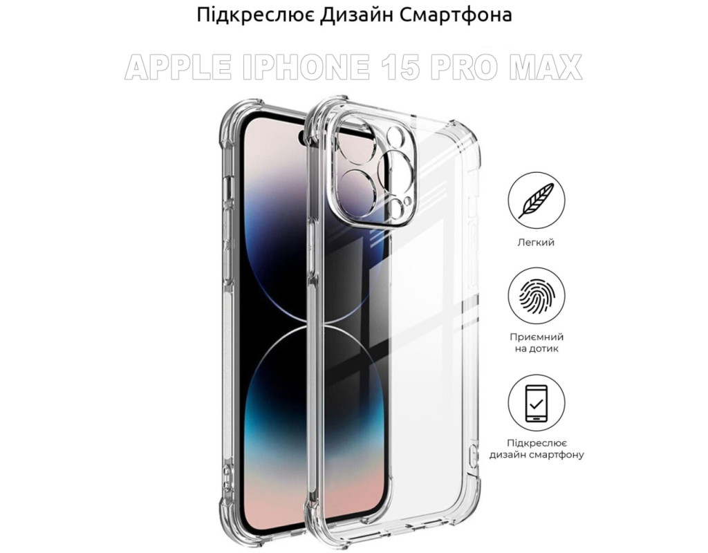 сумісність з моделями - Apple iPhone 15 Pro Max, Тип чохла для телефону - накладка, Призначення - модельний, Колір - прозорий