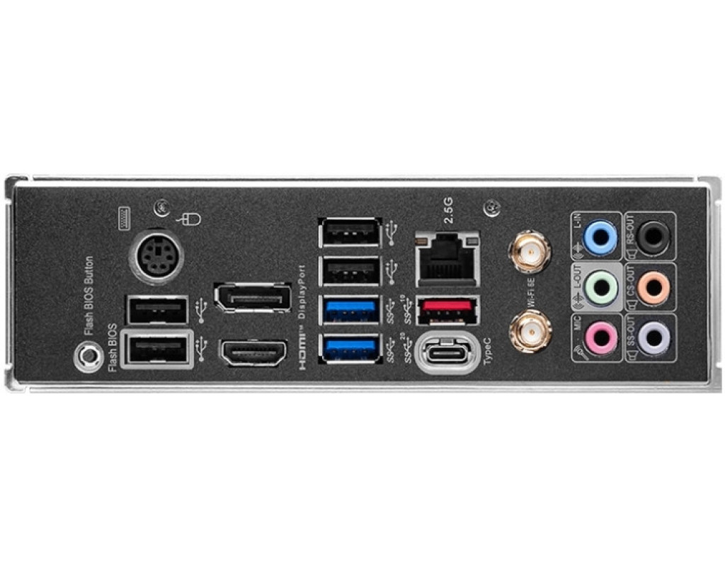1 x DisplayPort, 1 x Flash BIOS Button, 1 x HDMI, 1 x PS/2, 1 x RJ45, 1 x USB 3.2 Gen 2 10Gbps (Type-A), 1 x USB 3.2 Gen 2x2 Type-C, 2 x USB 3.2 Gen 1 Type-A, 4 x USB 2.0, 6 x Audio, Wi-Fi / Bluetooth Antenna |
