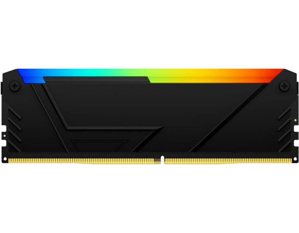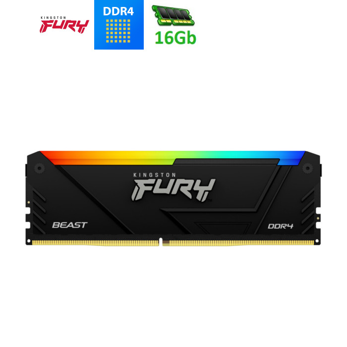 | Світлодіодна лінійка по верхній кромці всього модуля пам'яті може управлятися фірмовим програмним забезпеченням Kingston FURY CTRL*, а також спеціалізованим ПЗ, яке постачають у комплекті материнських плат, що підтримують управління світловими ефектами: ASUS Aura Sync, Gigabyte RGB Fusion і MSI Mystic Light Sync. У разі встановлення модулів пам'яті Kingston FURY Beast RGB DDR4 у плату, що не підтримує керування, вмикається режим хвилеподібного підсвічування, під час якого вздовж світлової лінійки циклічно проходять хвилі зміни кольору підсвічування. Для уникнення розсинхронізації динамічних світлових ефектів у пам'яті Kingston FURY Beast RGB DDR4 застосовано технологію синхронізації підсвічування з передаванням керівних сигналів інфрачервоним каналом - усі модулі, встановлені в материнську плату поруч один з одним, тепер переливаються синхронно, незалежно від наявності або відсутності зовнішнього управління. Таке рішення дало змогу як зберегти цілісність дизайну моддерського ПК, так і уникнути використання додаткових дротів. Живиться підсвічування безпосередньо від слота для пам'яті. Проста в установці і на більшості систем оперативна пам'ять, що налаштовується ввімкненням XMP профілю, дасть змогу швидко і без додаткових складнощів отримати максимум продуктивності від ПК. Завдяки стильному радіатору з RGB-підсвічуванням пам'ять Kingston FURY Beast RGB DDR4 має естетичний вигляд, водночас зберігаючи ефективне тепловідведення. Усі модулі пам'яті Kingston FURY Beast RGB DDR4 проходять обов'язкове заводське тестування на заявленій швидкості та забезпечені довічною гарантією. Особливості Kingston FURY Beast RGB: