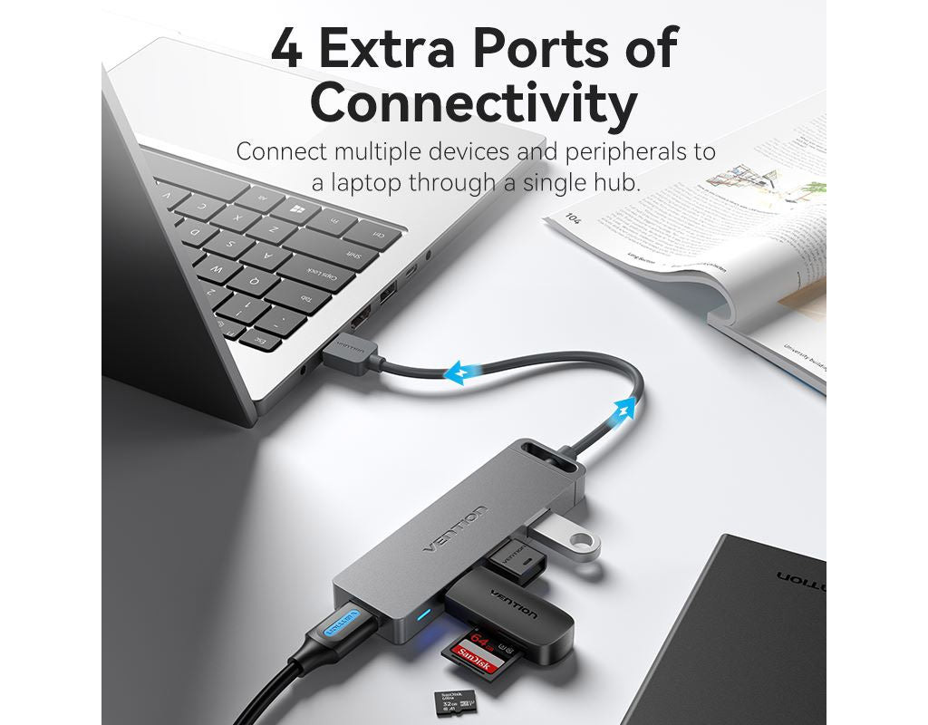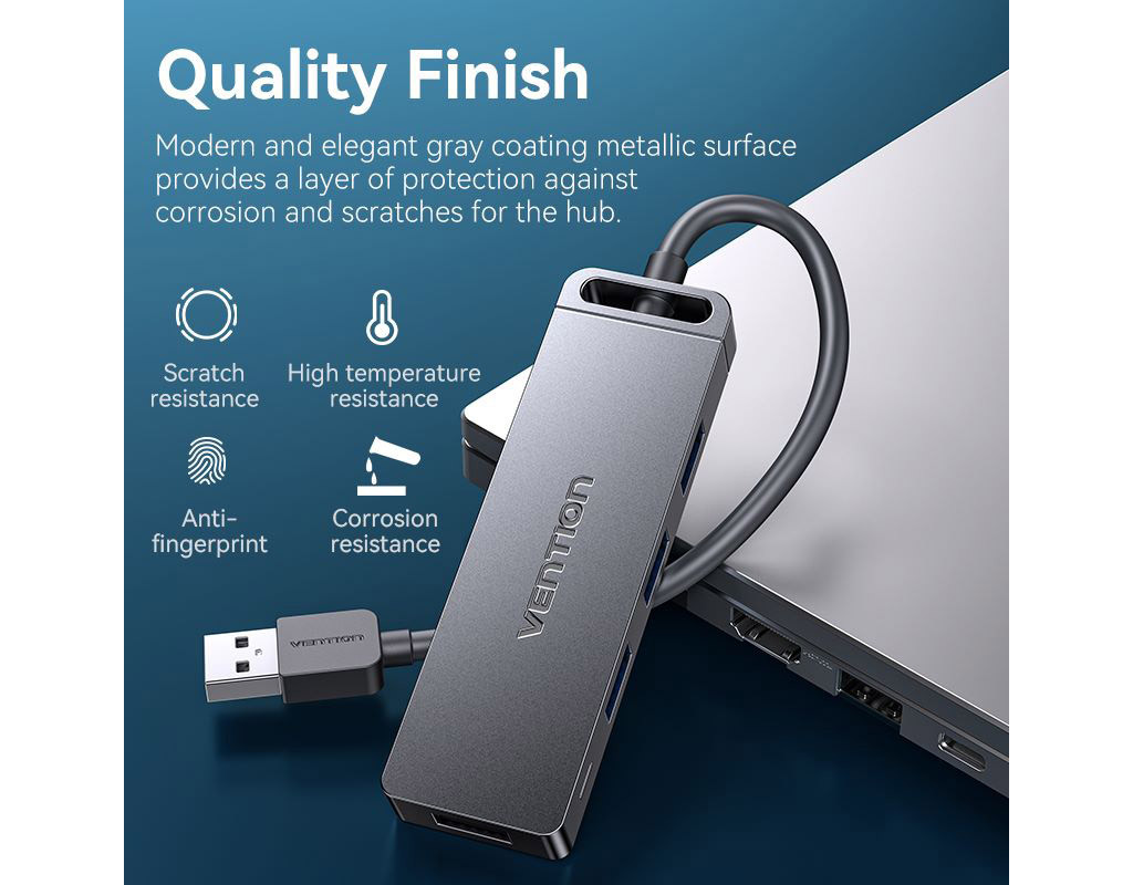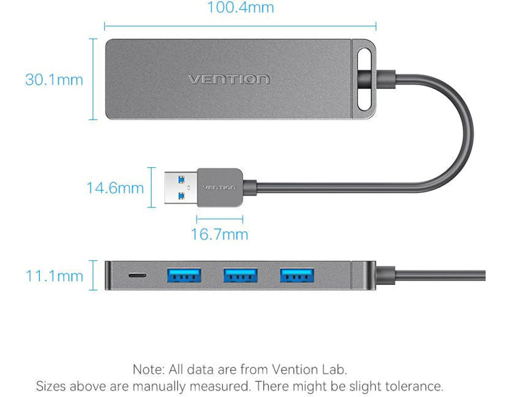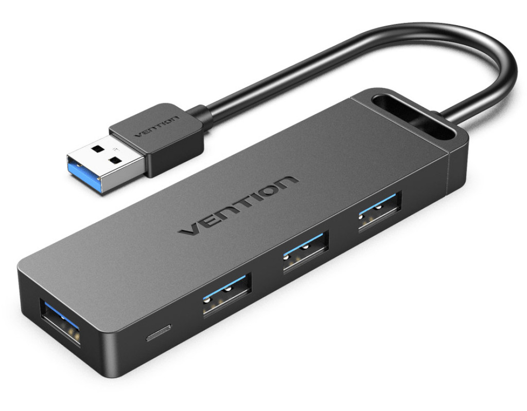USB хаб Vention дозволить власникам ноутбуків розширити кількість доступних роз'ємів високошвидкісного інтерфейсу USB 3.0 зі швидкістю передачі даних до 5 Гбіт/с. Хаб Vention дозволяє одночасно під'єднати до чотирьох пристроїв з однаковими чи різними інтерфейсами: USB 3.0, USB 2.0, USB 1.1. Ви зможете під'єднати через нього: USB мишу та клавіатуру, USB-флешки, зовнішній жорсткий диск HDD або SSD, відеокамеру, принтер, сканер та інші пристрої. Живлення адаптера забезпечується по шині USB, проте для підключення енергомістких пристроїв, таких як HDD необхідно підключати додаткове живлення через порт microUSB, розташований на корпусі хаба. Підтримує функцію Plug-and-Play та не потребує встановлення драйверів. Працює за технологією OTG. Технічні характеристики: