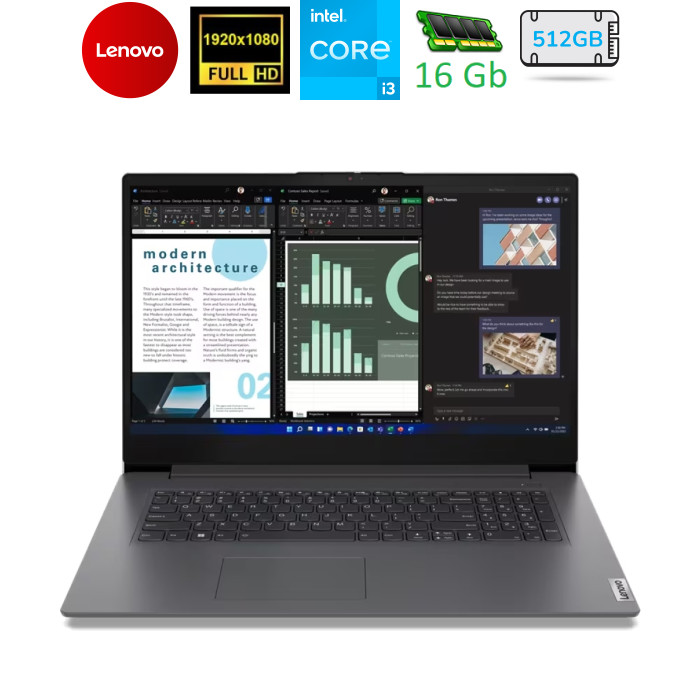 Lenovo V17 G4 — надійний ноутбук, який поєднує в собі виняткову продуктивність та великий екран. Завдяки високоякісному дизайну та передовим технологіям цей пристрій стане відмінним супутником у різних сценаріях використання. З великим 17.3-дюймовим дисплеєм з високою роздільною здатністю ви отримаєте яскраві, чіткі та деталізовані зображення. Він спростить роботу з презентаціями, мультимедійним контентом, діаграмами, адже надає більше площі для відтворення інформації. Начинку ноутбука представляє Intel Core i3-1315U, який забезпечує швидку та безперебійну роботу в різних завданнях. 16 ГБ оперативної пам'яті дозволяють ефективно виконувати багатозадачні завдання та відкривати вимогливі програми. SSD на 512 ГБ допоможе миттєво запустити систему й зберегти всю необхідну інформацію, колекцію ігор і фільмів. Пристрій оснащений двома стереодинаміками потужністю 1.5 Вт з технологією Dolby Audio, які забезпечують якісне звучання, що особливо важливо під час відеозв'язку або перегляду відео. Для комфортного під'єднання до онлайн-зустрічей є вбудована камера з роздільною здатністю 720p. Для забезпечення приватності вебкамера обладнана механічною шторкою. Lenovo V17 G4 можна брати з собою в офіс, додому чи в ділову поїздку. Акумулятор на 45 Вт/год забезпечить автономність до 7 годин (за даними виробника), чого достатньо для виконання нагальних завдань у дорозі. Lenovo V17 G4 — зручний пристрій для вирішення будь-яких питань! |