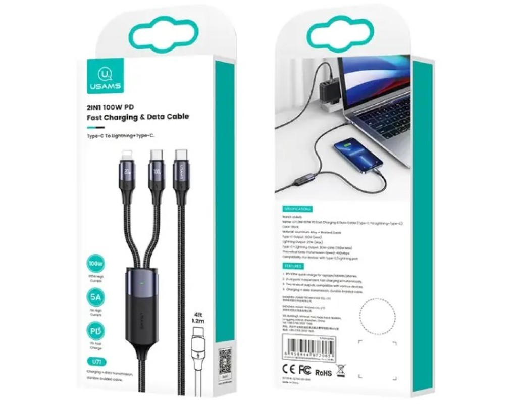 | Стильний кабель USAMS US-SJ550 U71 підійде кожному. 2in1 (блискавка, USB-C) дозволяє одночасно заряджати два пристрої. Нейлонове плетіння забезпечить тривалу та безвідмовну експлуатацію троса без ризику механічних пошкоджень. Кабель оснащений Smart Chip - інтелектуальною інтегральною схемою, яка захистить наш пристрій від несподіваних стрибків напруги. Посилені наконечники з гнучкого матеріалу. Виготовлений з якісних матеріалів: нейлон/алюміній. Забезпечує швидку зарядку до 5А. Алюмінієвий корпус та нейлонова обплетення для тривалого терміну служби. Захист від перенапруги, безпечний у використанні. Стійка до вигину конструкція.