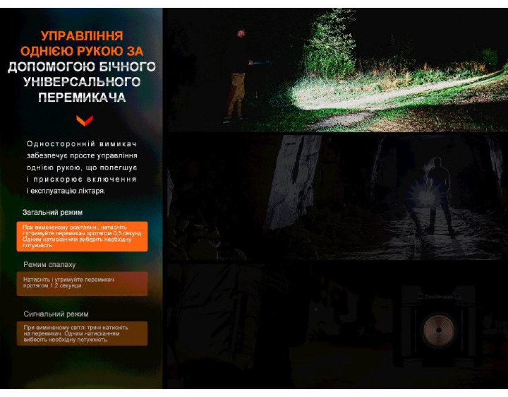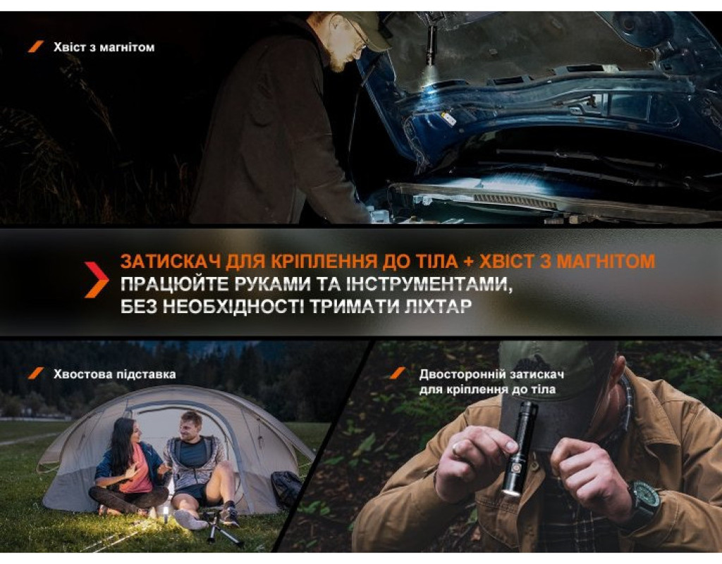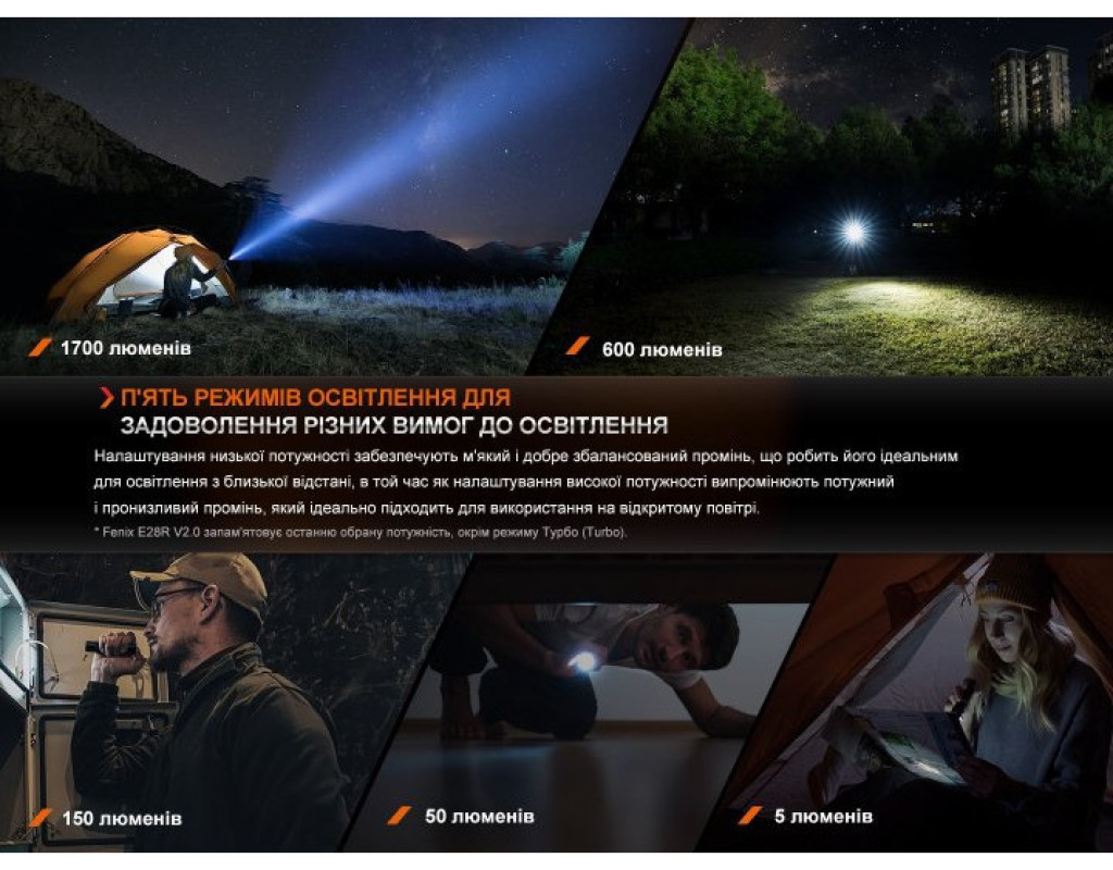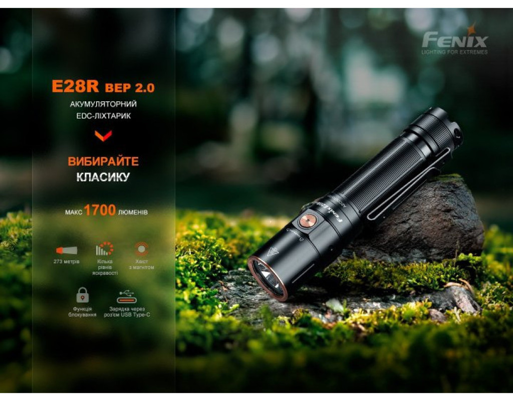 | Ліхтар Fenix E28R V2.0 (E28RV20) — це поєднання сучасних технологій із надійністю, що створено для тих, хто цінує високу якість і функціональність у компактному дизайні. Цей ручний ліхтар має потужне джерело світла — світлодіод Luminus SST40, що забезпечує яскравість у 1700 люмен і дальність світлового потоку до 273 метрів. Зроблений з увагою до найдрібніших деталей, він ідеально підходить для використання в різних умовах, забезпечуючи високу якість освітлення та надійність навіть у найскладніших ситуаціях. Особливості та переваги Fenix E28R V2.0 вражають. Цей ліхтар може похвалитися семи режимами яскравості, розподіленими на три основні групи. Включає такі режими: турбо, високий, середній, низький, еко, стробоскоп та унікальне підсвічування кнопки керування, що спрощує пошук ліхтаря у темряві. Турбо-режим забезпечує максимальну яскравість і сяйво на вражаючій відстані до 273 метрів протягом 2 годин 10 хвилин. Особливий режим підсвічування дозволяє оперативно знайти пристрій у темних приміщеннях або на природі. Ліхтар E28R V2.0 оснащений сучасною системою управління, яка забезпечується одним електронним перемикачем. Це дозволяє легко вибирати потрібний режим. Завдяки функції пам'яті, ліхтар запам'ятовує останній використаний режим і автоматично активується в ньому при увімкненні, за винятком турбо-режиму. Для забезпечення безпеки передбачено режим електронного блокування, який активується подвійним натисканням кнопки, захищаючи від випадкового ввімкнення. Джерелом живлення слугує акумулятор 18650 з можливістю заміни на CR123A, що забезпечує до 260 годин безперервної роботи в економічному режимі. Заряджання здійснюється через USB Type-C, що додає мобільності та зручності, зокрема, зарядка триває приблизно 3 години. Оснащений індикатором живлення, Fenix E28R V2.0 інформує про рівень заряду батареї, дозволяючи своєчасно поповнювати енергію. Корпус ліхтаря виготовлено з анодованого алюмінію, що надає виробу міцності та довговічності. Стандарт захисту IP68 запобігає потраплянню води та пилу, а удароміцність до 1 метра робить виріб стійким до падінь і механічних пошкоджень. Завдяки магнітній основі, ліхтар легко фіксується на металевих поверхнях, дозволяючи звільнити обидві руки для виконання різних завдань. Компактність та легкість (вага всього 128 г) роблять Fenix E28R V2.0 ідеальним вибором для носіння як у рюкзаку, так і у дамській сумочці. Універсальна знімна кліпса дає можливість закріпити ліхтар на поясі або кишені, забезпечуючи швидкий доступ до джерела світла в будь-який момент. Завдяки довершеним розмірам (121 мм у довжину), виключній зручності й вражаючим характеристикам, ліхтар Fenix E28R V2.0 відмінно підходить для походів, автомобільних пригод, професійного використання, а також як надійний компаньйон у повсякденному житті. |