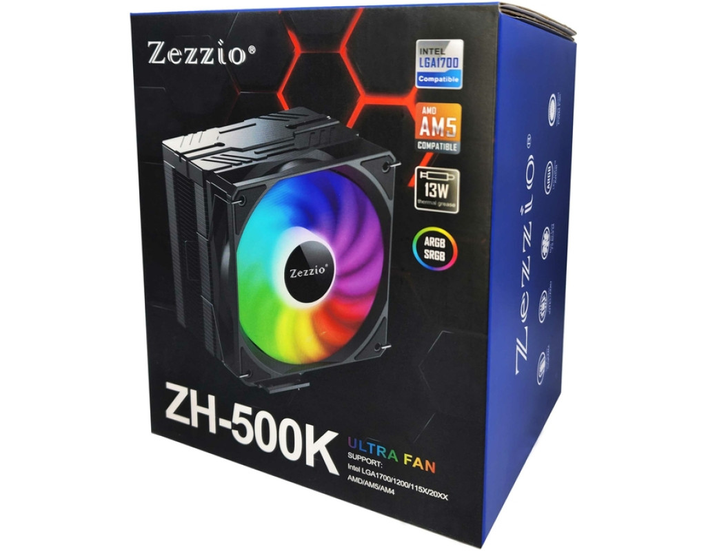 Zezzio ZH-500K ARGB нове рішення для охолодження сучасних процесорів. Стильний та ефективний дизайн, просте болтове кріплення, потужний та продуктивний вентилятор c керованим та статичним підсвічуванням ARGB/SRGB версії 5В 3 Пін, та п’ять мідних трубок у великому радіаторі. Використання технології H.D.T 3.0 Потужний радіатор охолодження Продуктивний вентилятор Два види підсвічування Унікальна властивість вентилятора даної моделі це наявність двох видів відсвічування: ARGB та SRGB. Підсвічування ARGB версії 5В 3Пін забезпечує реалізацію різноманітних світлових ефектів і працює від вбудованого або зовнішнього контролеру ARGB версії 5В 3Пін. Має синхронізацію з ASUS AURA, MSI Mystic light, Gigabyte FUSION та інших виробників материнських плат. Якщо не підключати кабель синхронізації підсвічування до контролеру ARGB, вентилятор буде світитися яскравими статичним підсвічуванням без можливості керування кольорами. Захист від вібрації Болтове монтажне кріплення |