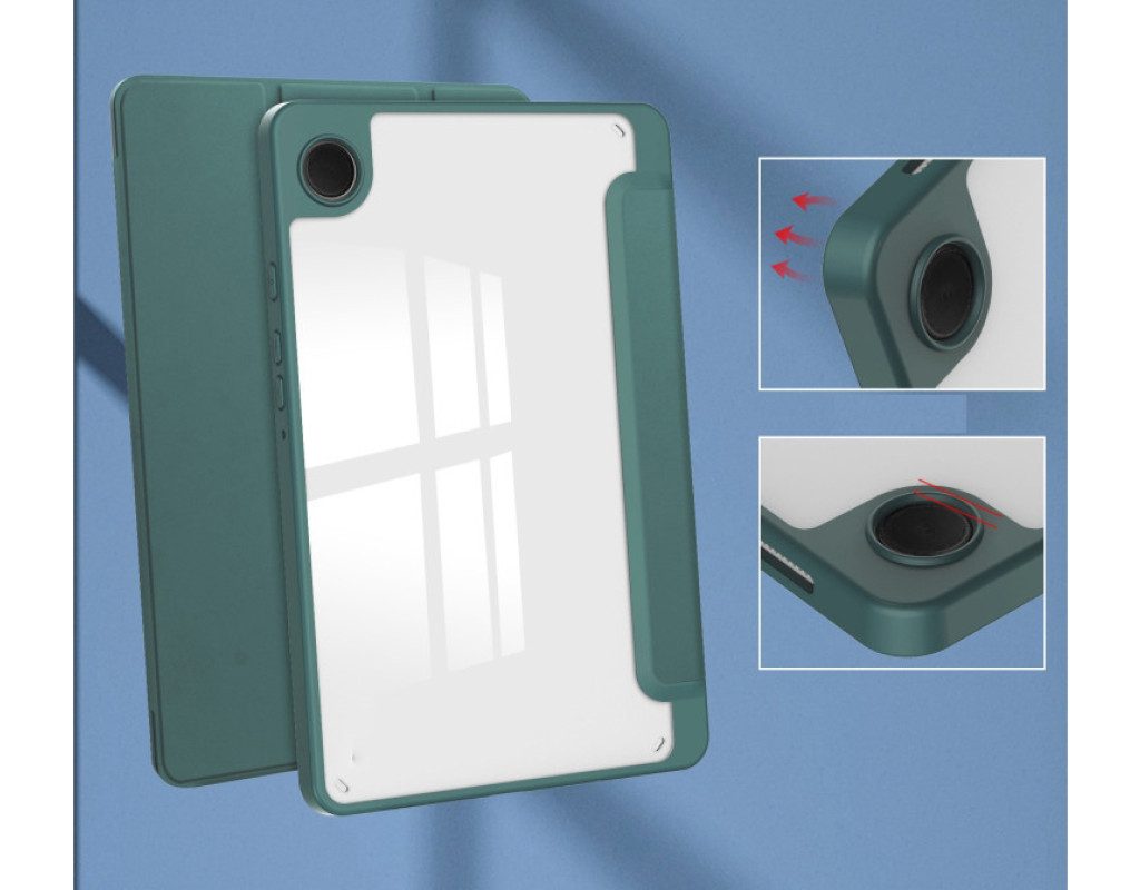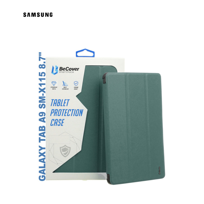 Тип - обкладинка, Сумісність з моделями - Samsung Galaxy Tab A9, діагональ - 8.7, Спосіб кріплення - обкладинка, спосіб закриття - магніт, Матеріал - штучна шкіра, пластик, темно-зелений